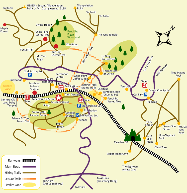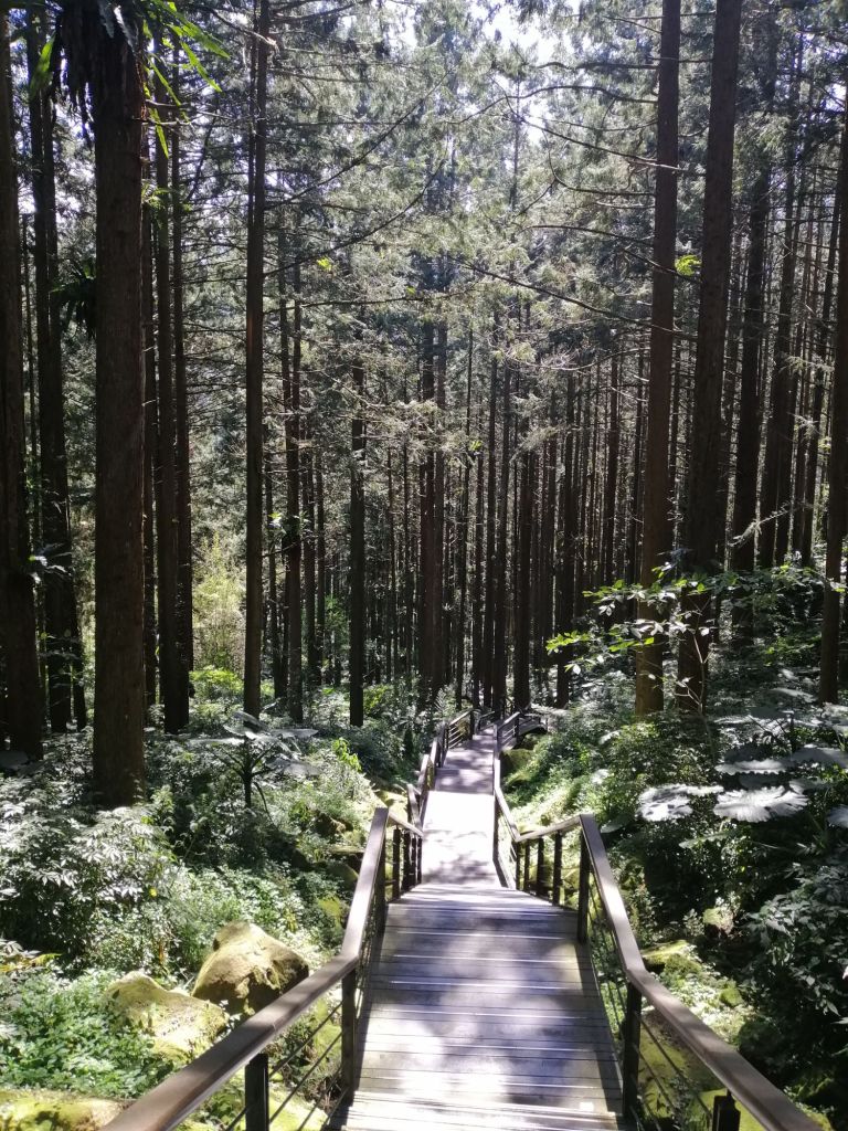 From Zhaoping, we walked alongside the secondary rail track toward Sister Ponds. The cedar forest felt calm and hushed beneath dense mist, with fallen ancient trunks that had collapsed due to aging. Passing Magnolia gardens, we reached the colourful Shouzen Temple near Xianglin Service Area (bus stop), where food and drinks were available. From there, we turned onto the Giant Tree Boardwalk.