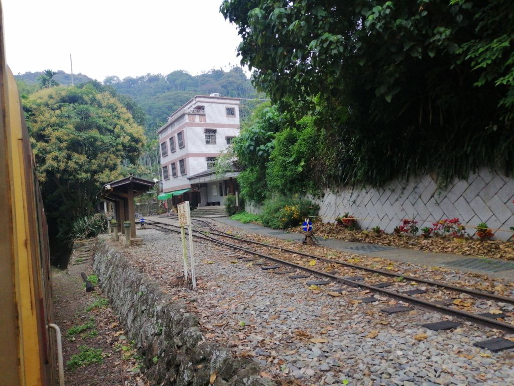 Soon after passing the Railway Garage, we stopped at Beimen Station, a Japanese-era structure painted green and milky blue. Still on the plains, the train rolled past urban areas, orchards, and greenhouses, with the last traces of cherry blossoms. After brief stops at Lumachan and Zhuqi Stations (132 m), where students ran frantically securing their seats, the scenery shifted. Crossing a river, urban life gave way to forests as we left the flat plains behind.