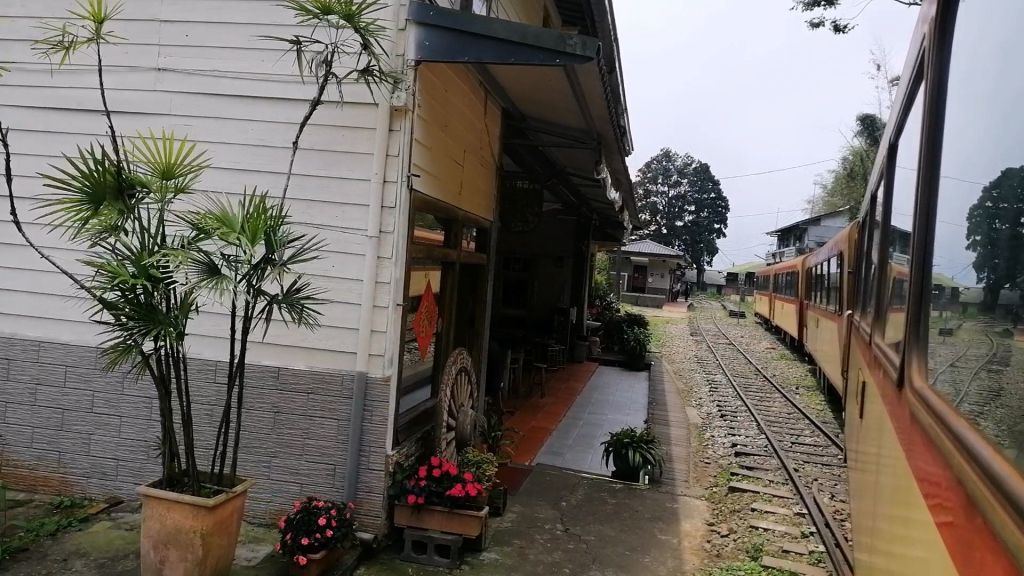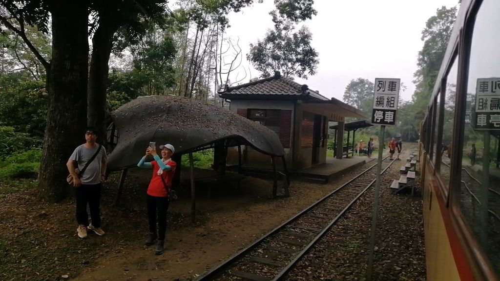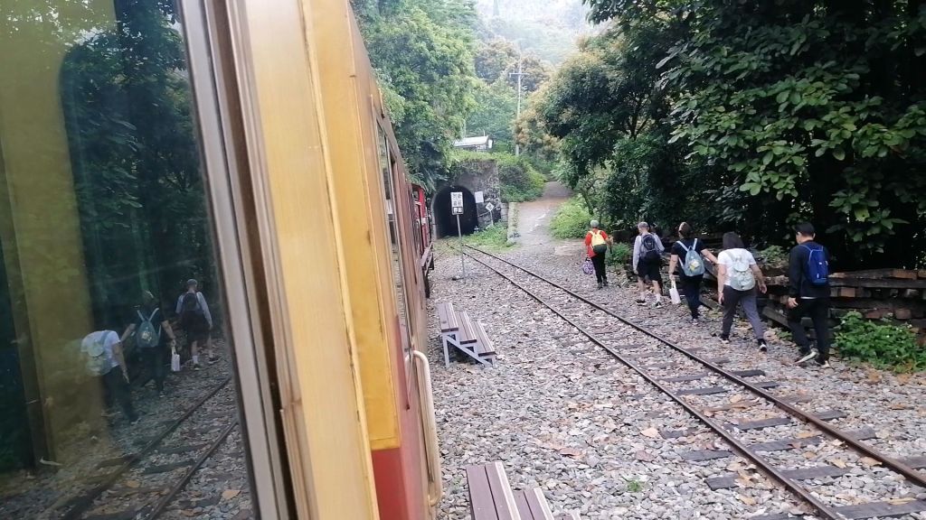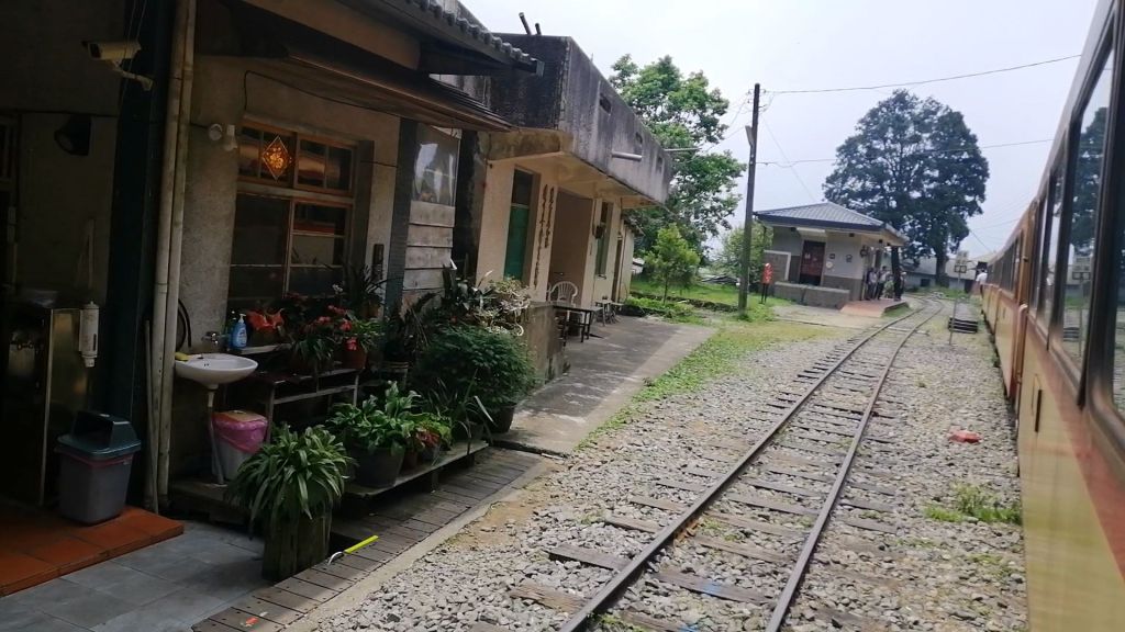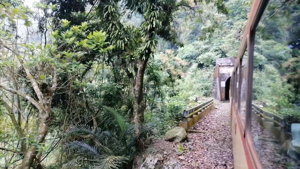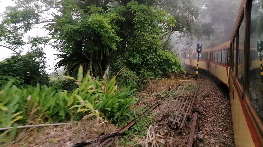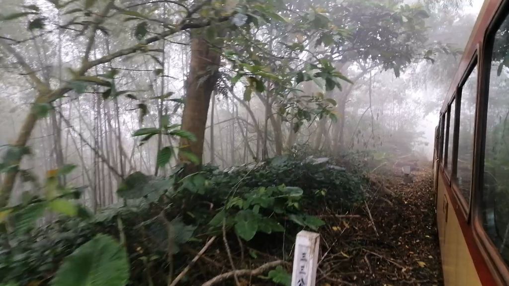 We arrived slightly late at Liyuanliao Station (904 m), where four foreign travellers boarded after arriving by taxi — a reminder that roads now link these villages, unlike the railway’s early days. Soon after departure, we entered a misty Alishan world. Fog enveloped the train, swallowing even the front coaches. Bamboo, ginger plants, and forest silhouettes faded in and out, and at Jiaoliping Station (997 m), the cooler air was unmistakable.