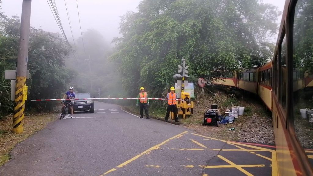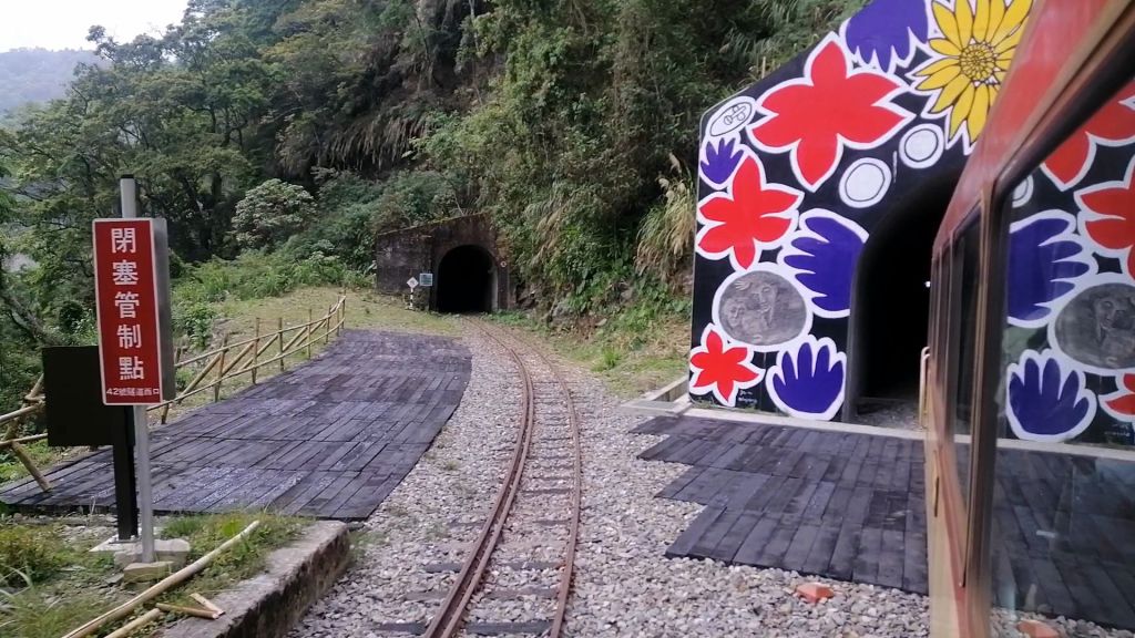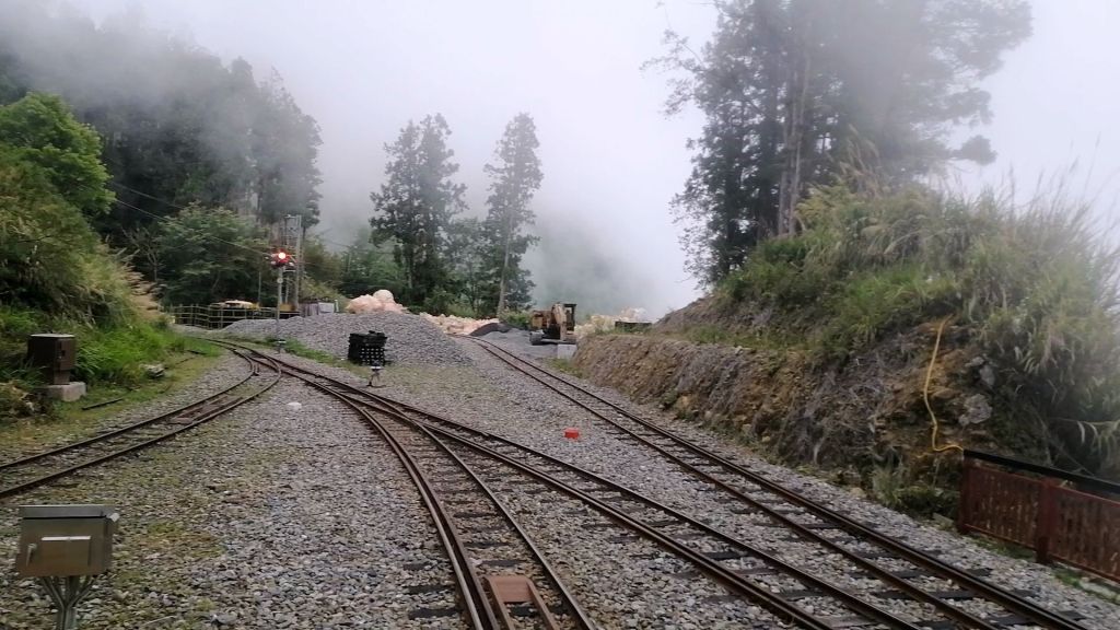 Low clouds clung to the canopy as we crossed bridges and entered a typhoon-damaged section, where one track diverged toward the abandoned Pingzhenna Station (1712m). We continued through a newer tunnel, decorated with aboriginal-style artwork. Construction camps, machinery, and stacks of red cypress logs implied ongoing railway works.