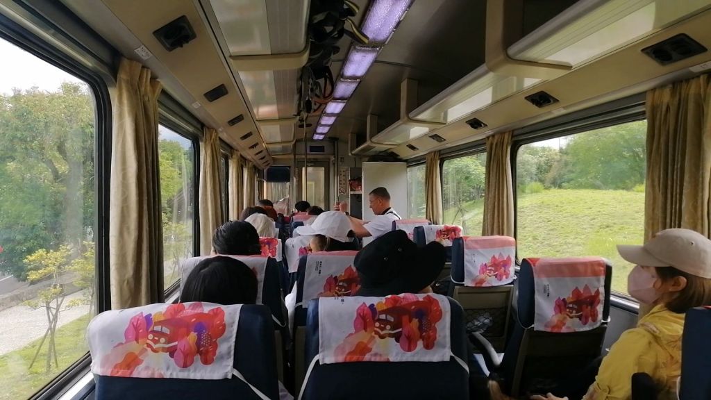 While waiting, a charter tourist train — the brightly coloured Vivid Express operated by Lion Travel — arrived, followed soon after by our Alishan Express, creating a burst of activity at the station. Like this Vivid Express, another special tour service – Formosensis train, is also operated by Lion Travel Services. It’s an alternative way to experience Alishan. At 1.20 p.m., we boarded for the uphill journey, Alishan Express 5, again with plenty of empty seats.