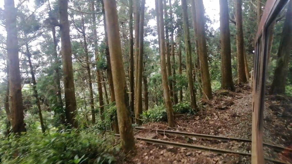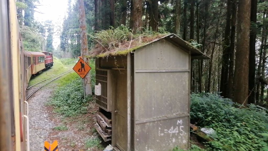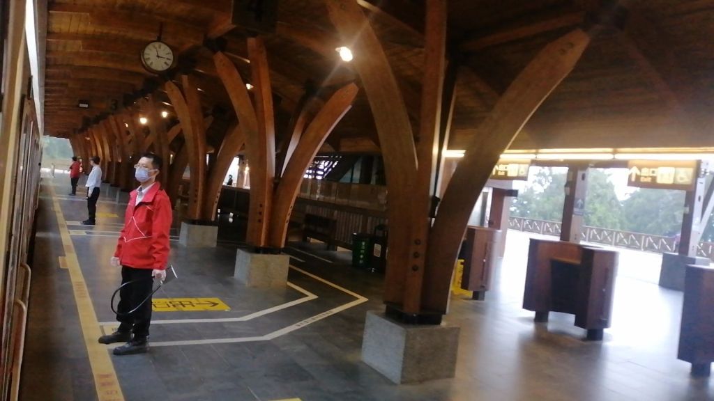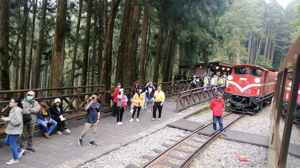 The climb resumed past felled cedar logs and machinery. Near Shenmu Station (2,138 m), passengers waited by a beautifully restored wooden building near the remnants of the Sacred Tree (at least remnants of the 3000 years old tree). This station is one of the three branch lines in Alishan. We paused briefly before the final approach.