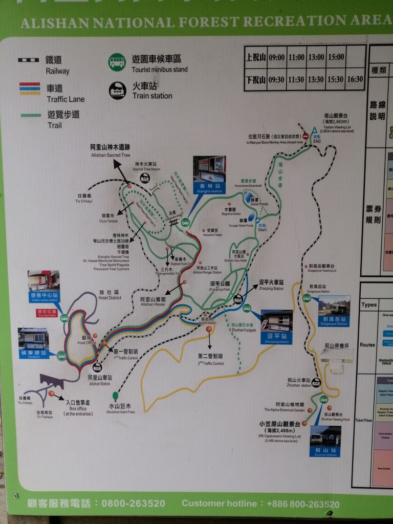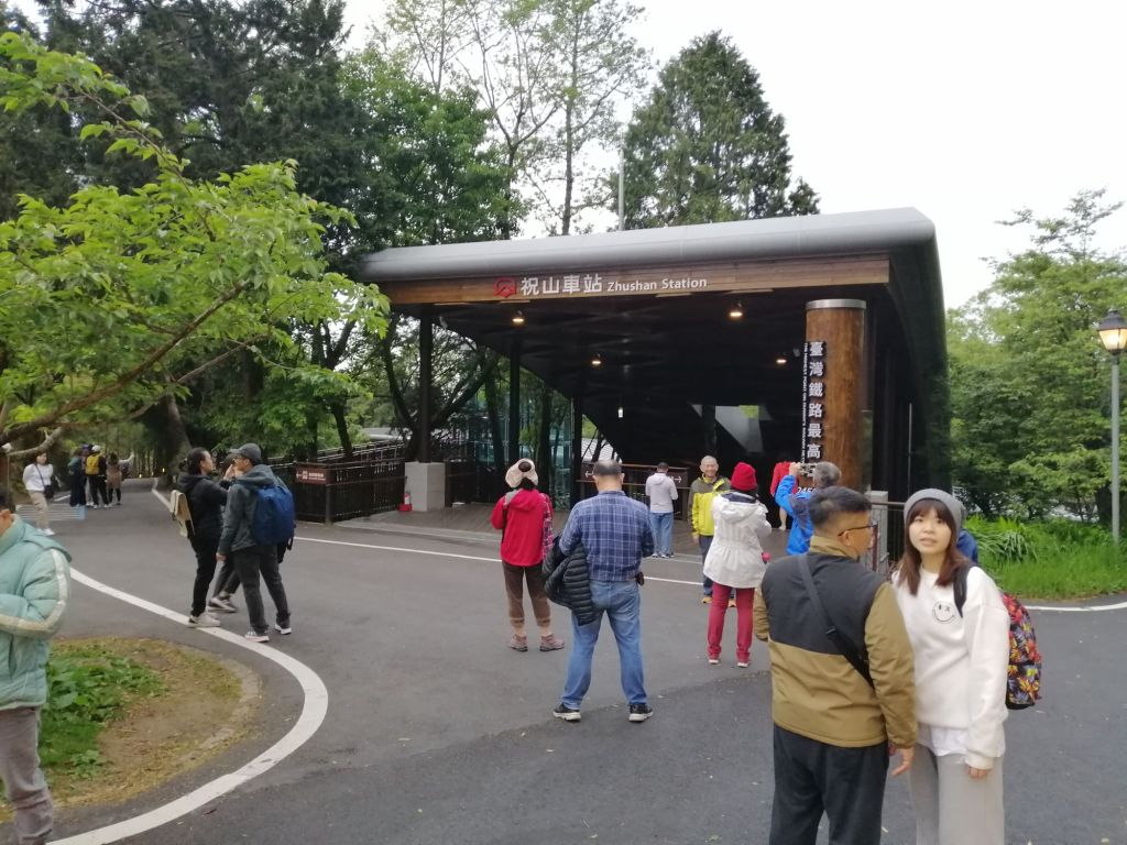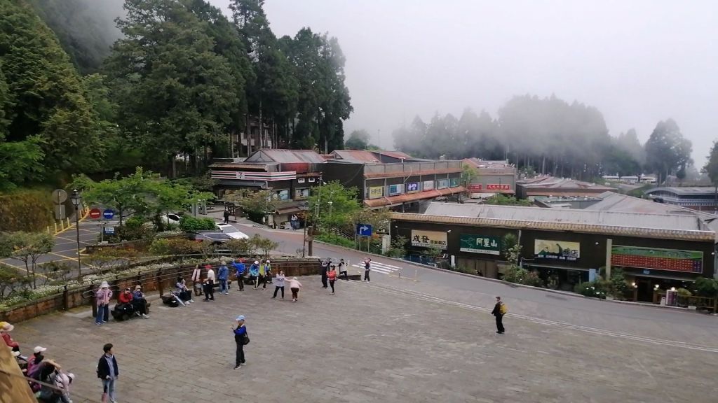 Heavy mist hung over a gloomy Alishan as temperatures dropped. The Alishan Recreation Area consists mainly of car parks, transportation and clustered accommodations. With limited and pricey lodging, I managed only a one-night stay — early booking is essential. After checking in and picking up a tourist map, we took a minibus from the parking area to Zhaoping Station (2,274 m) at around 4 p.m. Nearby Zhaoping Park, lined with cherry trees, still held a few lingering blossoms.