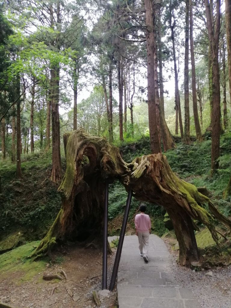 Walking among towering red cypress — many over 1,000 years old — was humbling. The forest edges faded into silhouettes as the mist thickened. Steps and planks led to Shenyi Waterfall and the beautifully designed Shenmu (Sacred Tree) Station, reached around 5.40 p.m. Built to follow the land’s contours, it preserves the surrounding forest. Nearby lie the remains of a once 3,000-year-old sacred cypress, destroyed by lightning. Many visitors arrive here by train to begin this forest walk.
