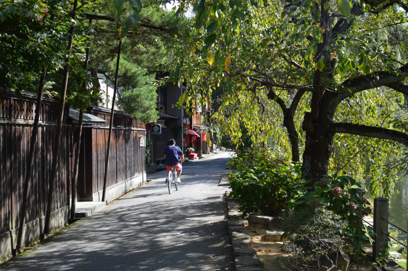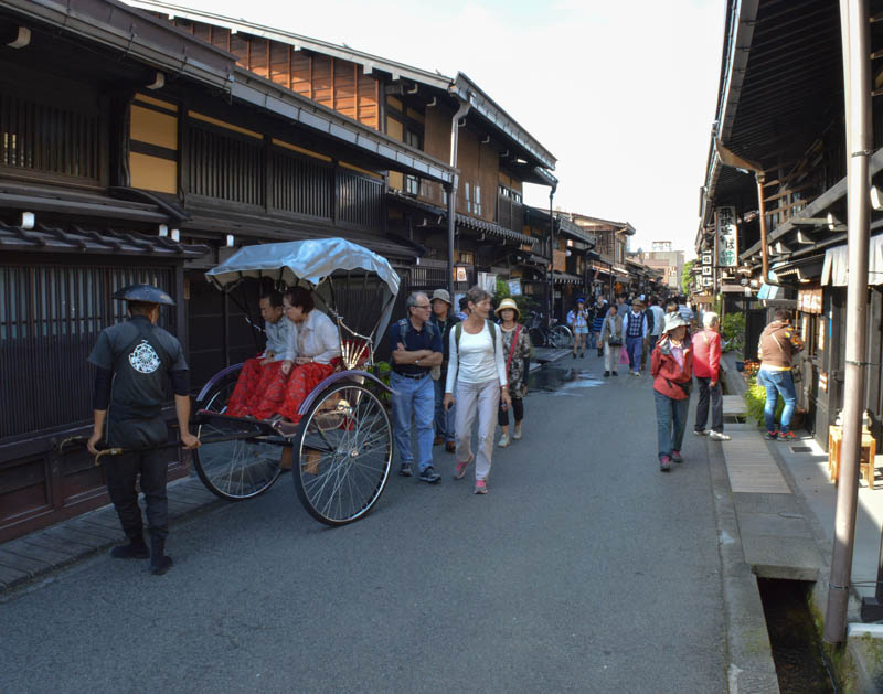 Although touristy, there are places where we could chill out, get some respite from the crowds like today. One such street is off the red Nakabashi Bridge. This street is planted with lovely cherry and willow trees that overlooked the slow flowing Miyagawa River. Small eateries and local handicraft shops are tucked away in this narrow leafy street. There were hardly any tourists here. Wandering these back streets is best done by walking which allowed an intimate experience with the old town. However, another mode of transport popular here is by using a rickshaw. Men and women dressed in black and wide hats hand pulled rickshaws through the historic streets. However, we did not try them.