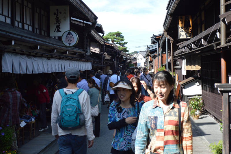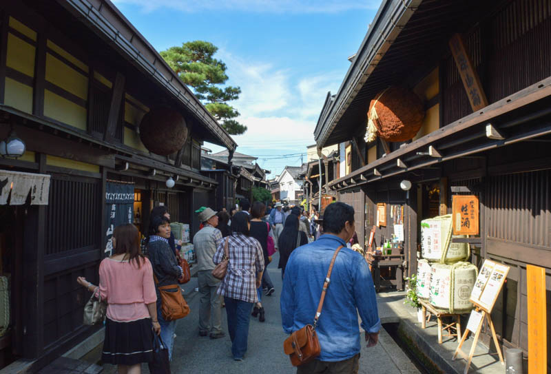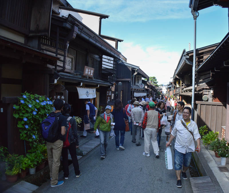 Throngs of people walked in these streets looking through museums, cafes, heritage homes, art and craft shops, and sake breweries amongst others. It is lovely to see ‘old’ Japan as most images of Japan are urbanised areas like neon lit Tokyo and Osaka. During the Edo Period, Takayama was the centre of high quality timber production. This preserved old town is fully made from timber. It has appeal and good feeling as we walked down the streets. Although crowded, it was easy to navigate through. Running water gushed through stone canals that ran parallel to the street and along the houses. Potted plants and climbing purple wisteria flowers add further appeal to this charming place.