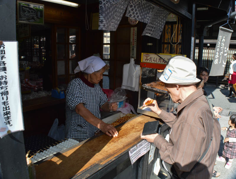 Takayama’s preserved old town, “shitamachi” dates back from the Edo Period [1600 – 1860]. Here, in its crowning days, many wealthy merchants lived here. Some of these homes are now opened to public. The most popular streets are in the south – Sannomachi, Ninomachi, Ichinomachi and Sanmachi. Takayama is also renowned for its high quality sake. Several breweries can be found around this old town. They are easily identified with barrels outside their premises and with a huge cedar ball hung above the door. The smell is also a good give-away. At one, I sampled a few. Traditionally, each serving comes in a small wooden box. Now, glasses are used. I loved the sweet plum sake.