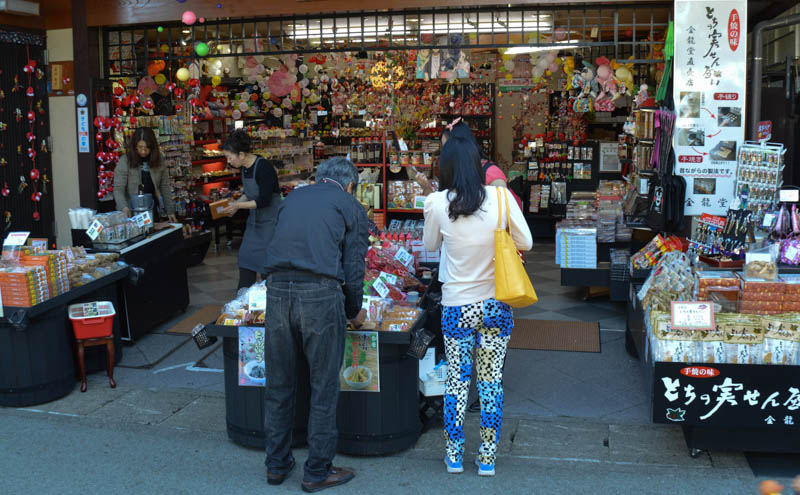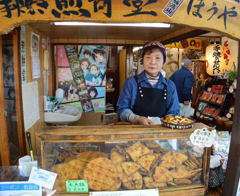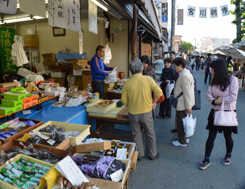 Several stalls offered cooked food. A lovely lady busily prepared the Japanese biscuits – “sanbei”, a cracker toasted with “teriyaki sauce”. A little salty and blend for me. We found these every wherein Japan. We bought some very sweet and crunchy biscuit – like a peanut brittle. The sugar content was enough to get us through the day. The day was turning out to be hot and sunny with blue skies.
