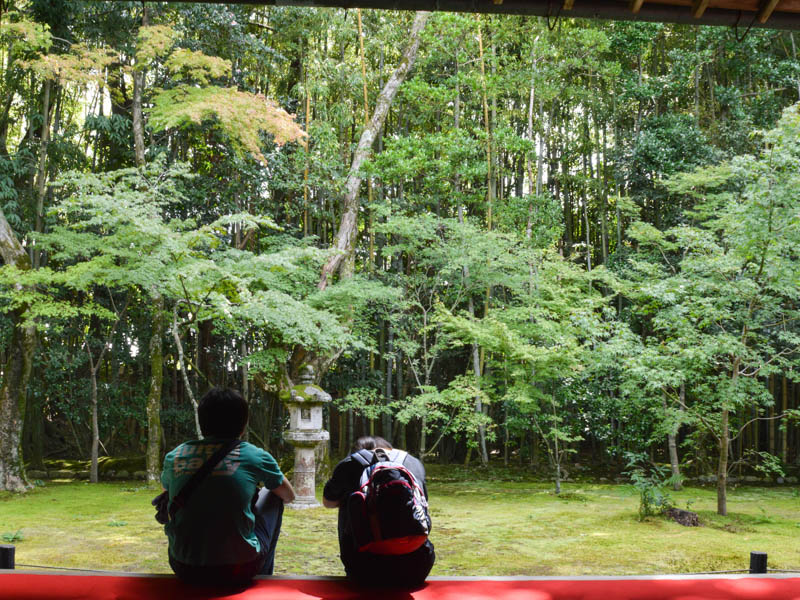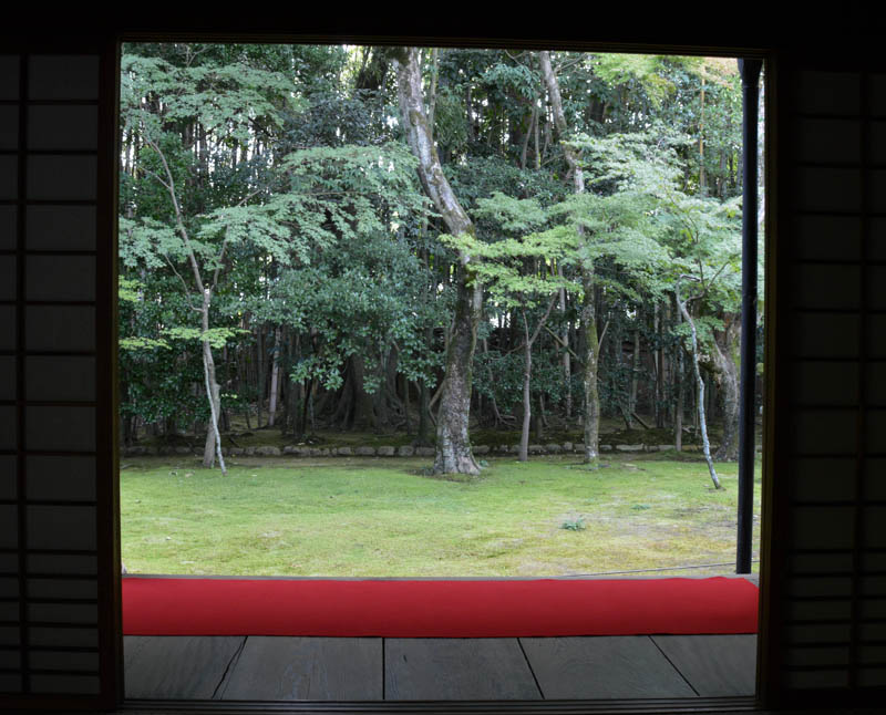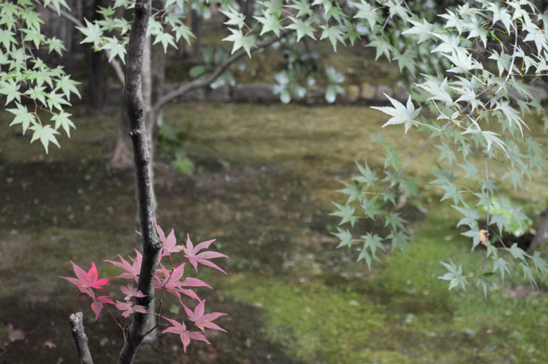 a focal point. This garden had been my favourite so far. In one corner, a single maple tree had only a few bright pinkish leaves that were just starting to colour. I could only imagine the colours of these maples in late autumn. A couple sat on the red carpet reflecting their own lives. Within the “Hojo”, walls are painted with murals and calligraphy. An elderly man, seated on tatami floors, was absorbed with one particular painting.