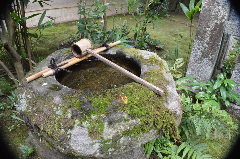 On the western front of the “Hojo”, a few roughly places natural stones connected to the adjacent warm dark wood coloured tea rooms. This tea garden, in contrast with the “Hojo” courtyard garden, however, is densely planted with variegated grasses, shrubs, sculptured pines, more maples and structural cycads. I loved the subtle variations in the foliage colours and their textures, particularly in the partially filtered light today. Flowering plants are nowhere to be seen. In a secluded corner is a “tsukubai”, stone water trough teeming with moss and ferns. A bamboo ladle is placed on top. We strolled with no words spoken in this enchanted temple garden.