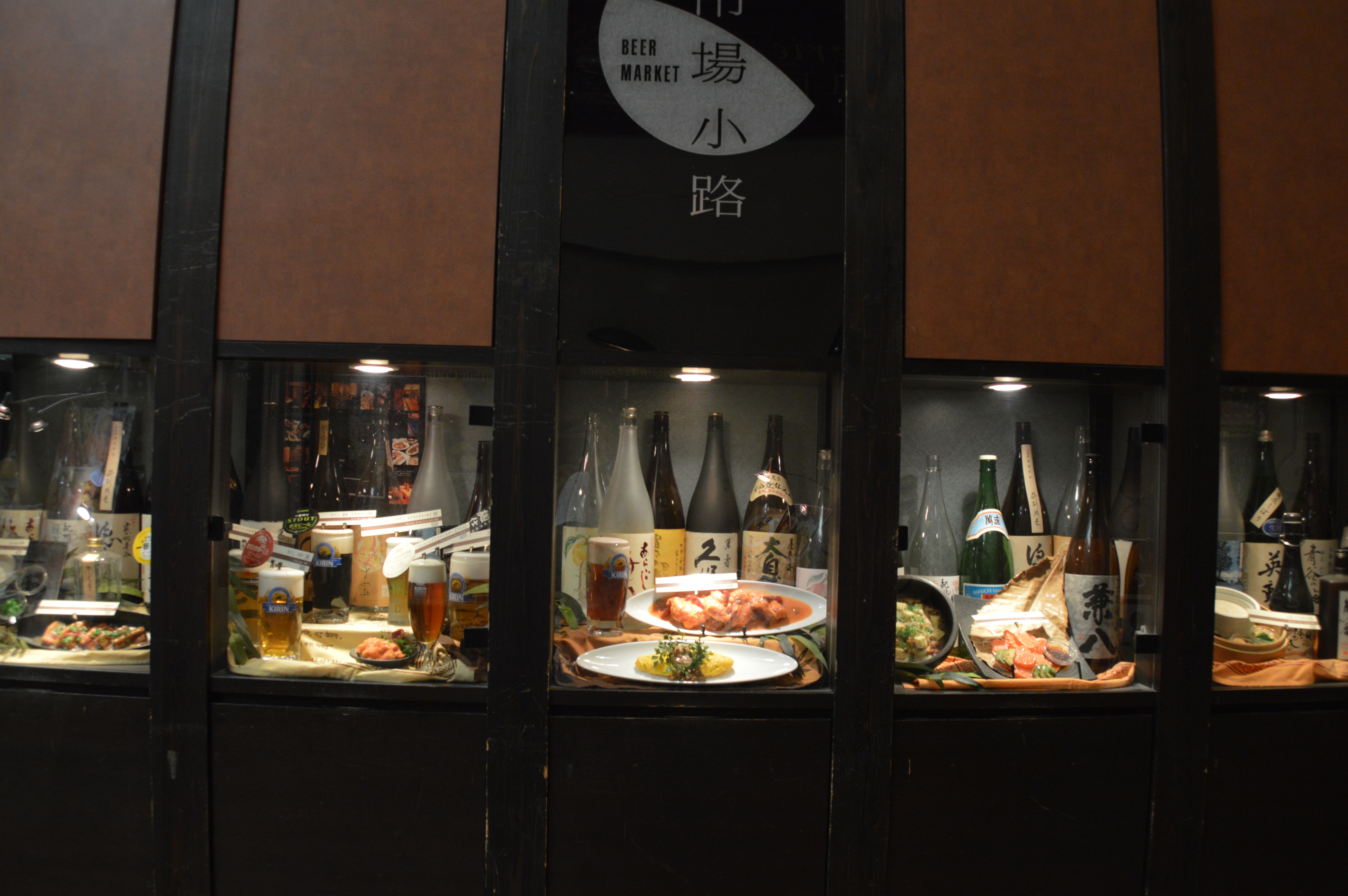 With soft light from road side lanterns and dimly lit street lights, this street oozed charm and a feeling of stepping back in time of the Edo Period. Although narrow and crowded, the paved street was pleasant enough to stroll. With numerous choices of eateries, we were careful to read the menu, some in English, and check out the prices before venturing inside. High end tea houses entertained by geisha are also intermingled here. Samples of dishes in plastic and interestingly displays of fresh vegetable were laid at the entrances. Sake bottles lay at the doors to entice and welcome visitors. Everything is neat, tidy and certainly inviting.