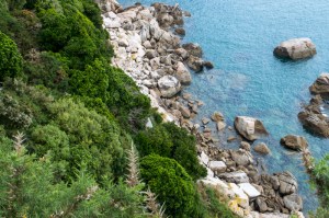 We came across many kill traps set up by DOC to get rid of introduced pest like rodents. Flowering Lupine can be found in small clusters. It was a gradual walk and from the hills, we had a fantastic view of Mutton Cove. On a narrow path we edged towards Separation Point around 1000. The water was absolutely clear. At the bottom of the rocky beach, fur laid sunning on the rocks while some swam happily in the water. On a steep path, I descended to the edge of this rocky outcrop. Lots of flax, prickly plants and gorse bushes along the path. Besides seal, gannets also make this isolated place home, when in season. Beyond this point is the Tasman Sea.