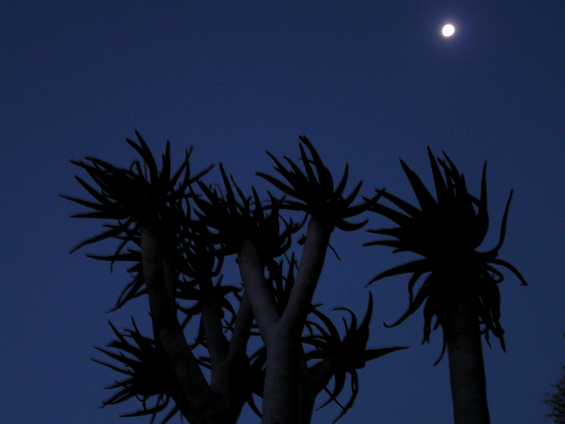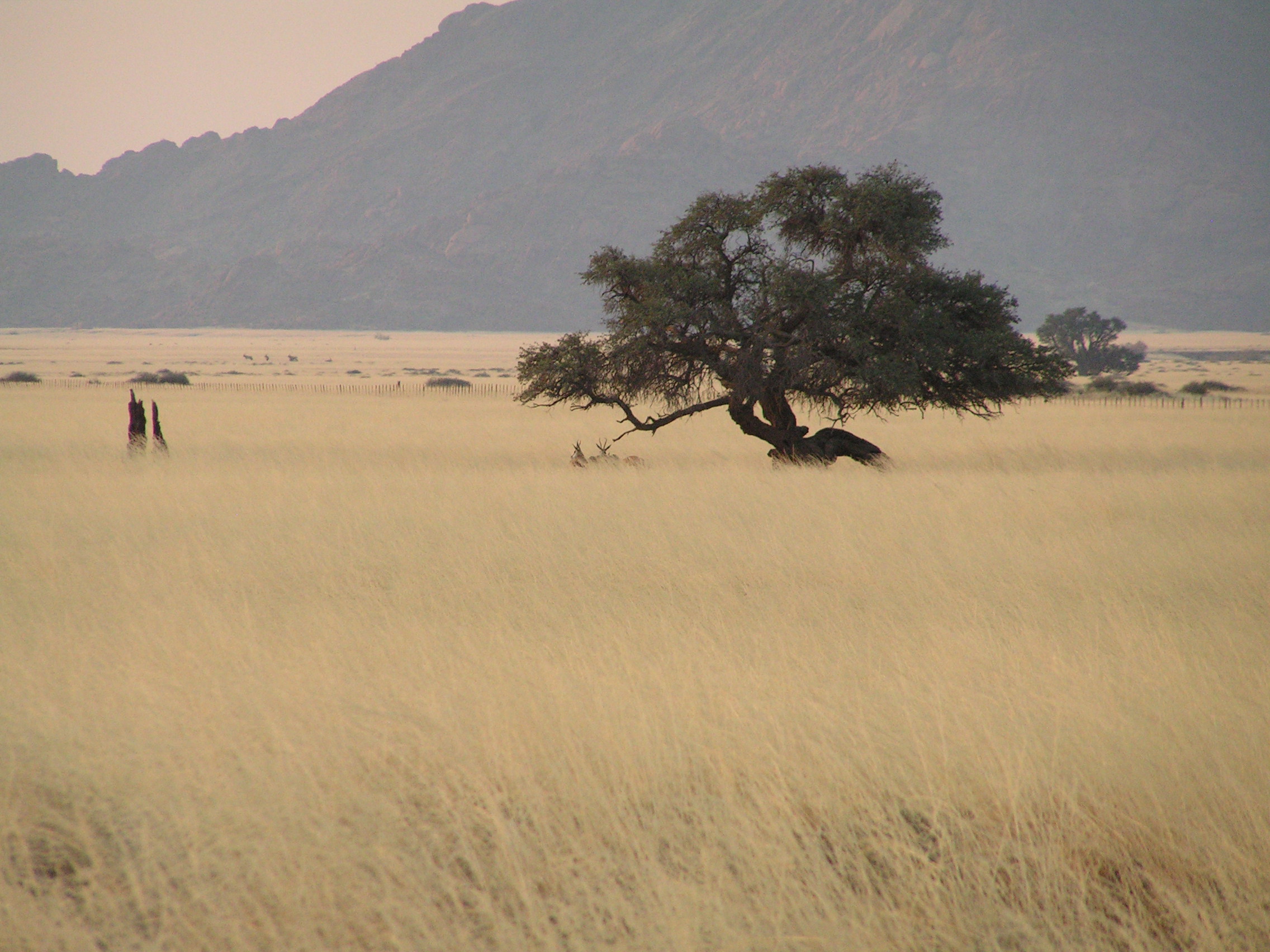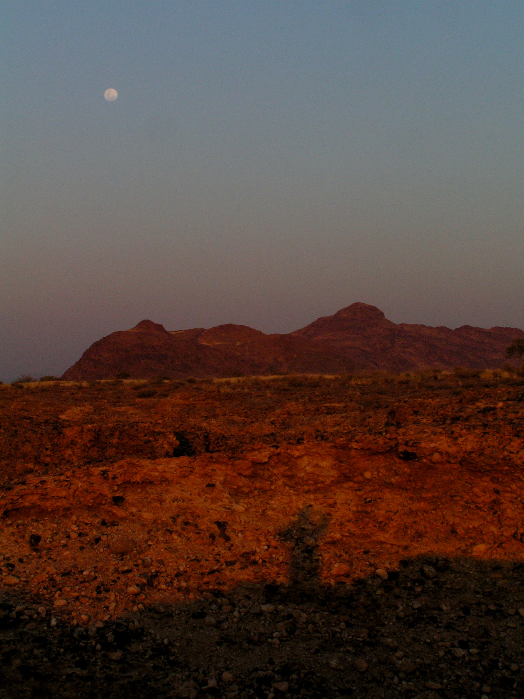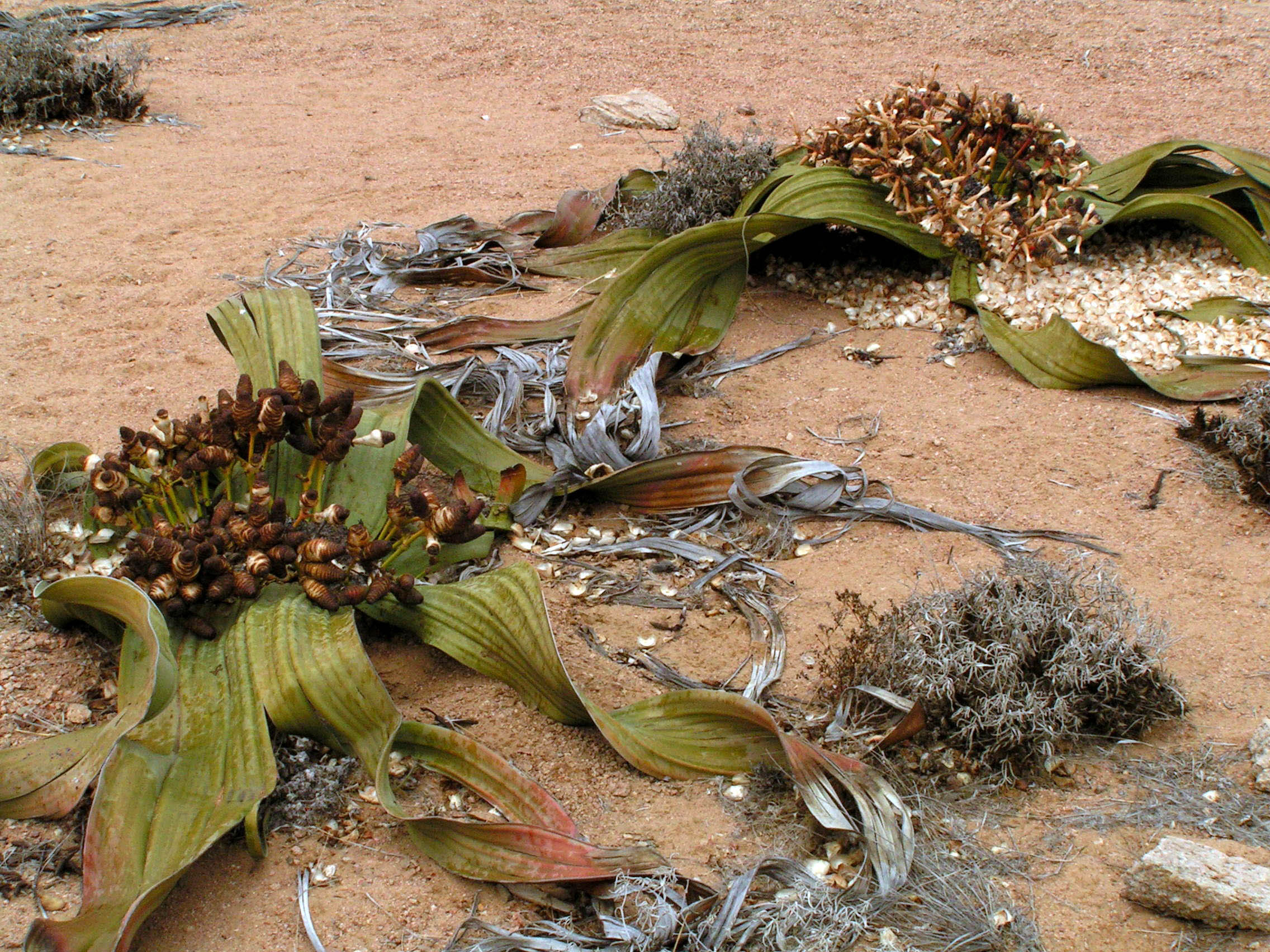 Along the Swokop River was a strange and bare landscape called the Moon Landscape. Soft stones had been eroded by the river leaving behind exposed layers of hard rocks. At one spot we walked around some boulder rocks. I was surprised to find black fragments of dried lichens attached to the surfaces. When water is sprinkled onto them, like magic, the foliage moved and crackling sound emerged. From shades pale green to bright green, with black under surface. Looking more closely, there seem to be many types around. The desert is not inert at all. A black ridge of dolerite formed on the backbone of the mountains stretched far. This hard rock had remained as erosion had removed the soft rocks. We continued further on the desert sand roads to the witness a rare plant – Welwitschia mirabilis. These plants are unique to the Namib. Only two leaves are produced in its entire life. As they grow they twist and curl and the edges eventually tear. Its survival is remarkable. Besides the harsh environment, man is assisting its unfortunate decimation. The male and female plants were in flower at this time. The plant also provided a home to a variety of beetles including the tok-tokkie and other colorful insects. In the open planes, wires from telegraph pole stretched to the horizon. Tiny spots of fungus covered vast areas of the arid surface . It is refreshing to witness that the harshest deserts managed to support life in a delicate environment.