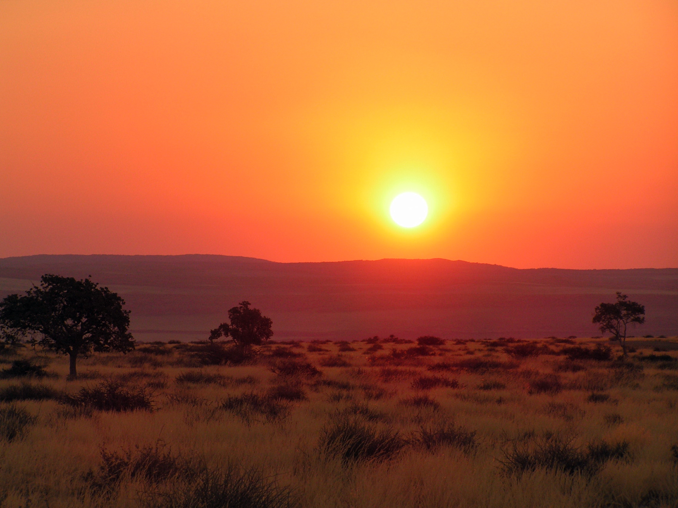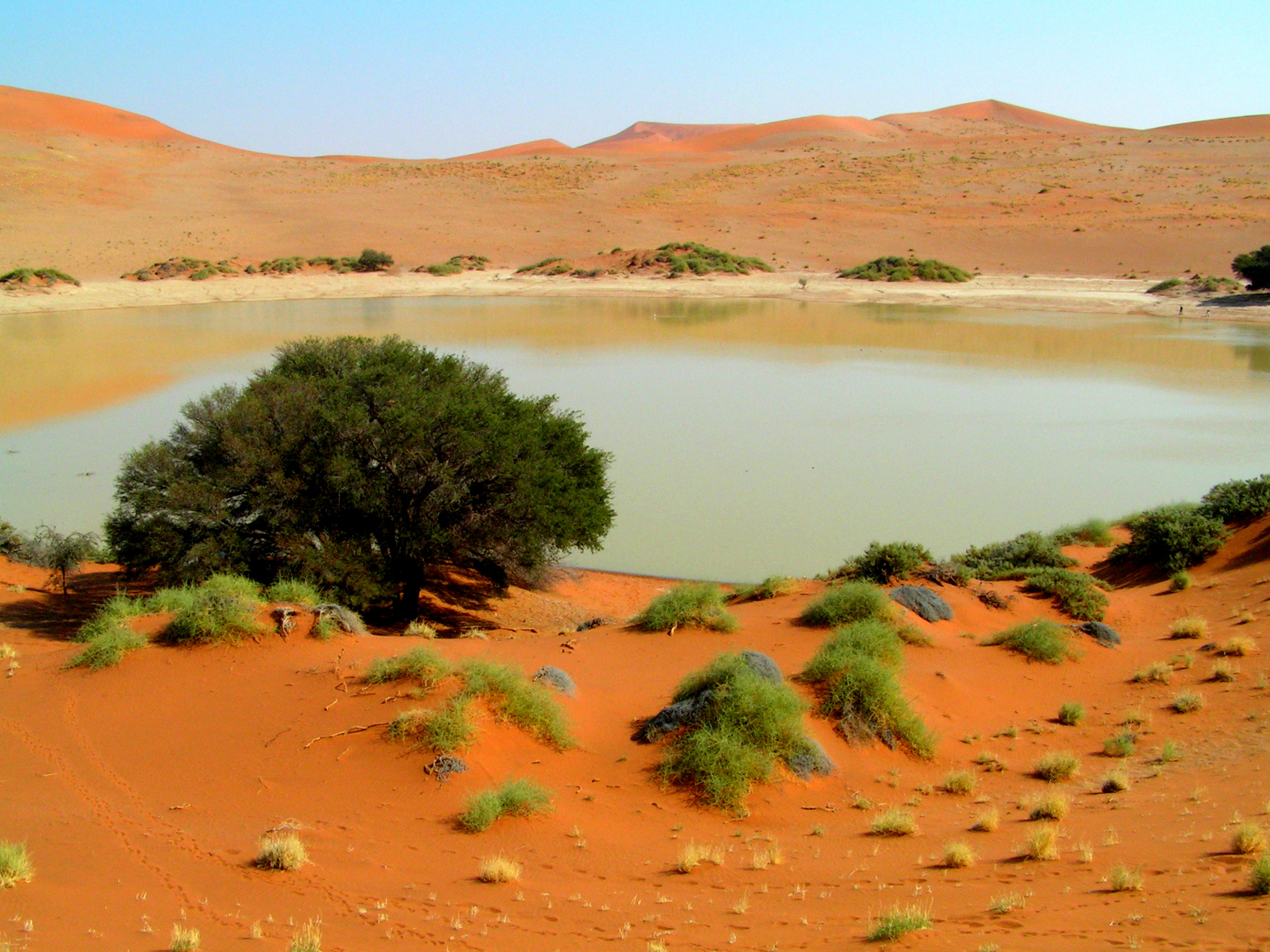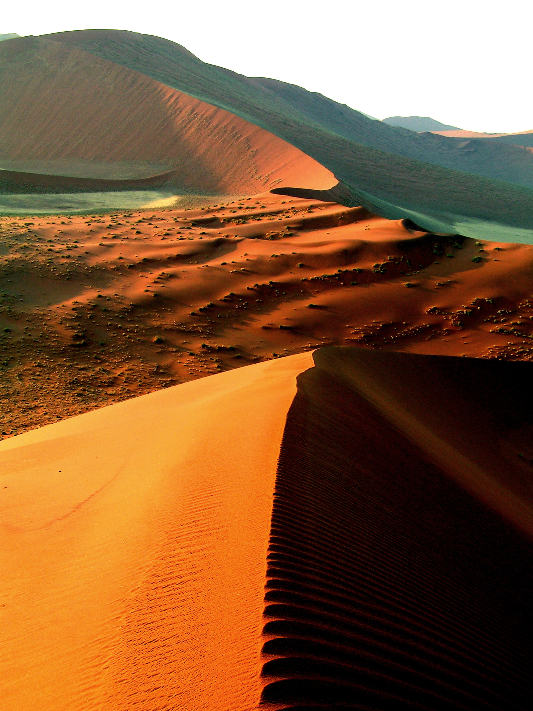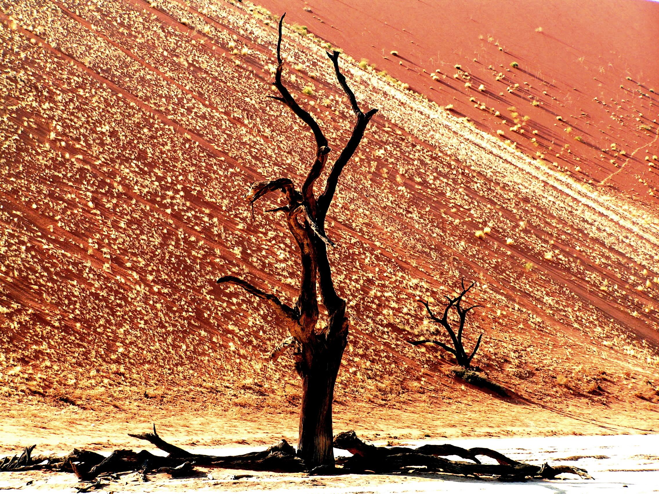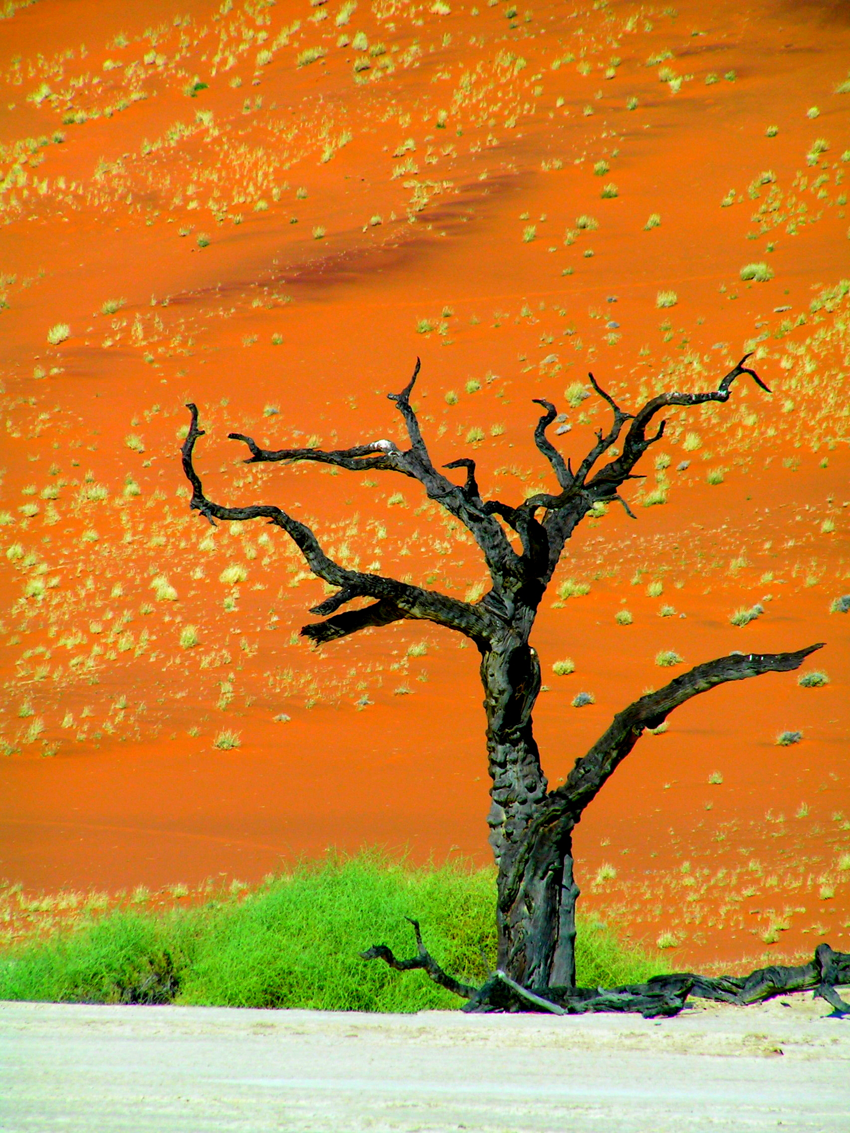 Along the Swokop River was a strange and bare landscape called the Moon Landscape. Soft stones had been eroded by the river leaving behind exposed layers of hard rocks. At one spot we walked around some boulder rocks. I was surprised to find black fragments of dried lichens attached to the surfaces. When water is sprinkled onto them, like magic, the foliage moved and crackling sound emerged. From shades pale green to bright green, with black under surface. Looking more closely, there seem to be many types around. The desert is not inert at all. A black ridge of dolerite formed on the backbone of the mountains stretched far. This hard rock had remained as erosion had removed the soft rocks. We continued further on the desert sand roads to the witness a rare plant – Welwitschia mirabilis. These plants are unique to the Namib. Only two leaves are produced in its entire life. As they grow they twist and curl and the edges eventually tear. Its survival is remarkable. Besides the harsh environment, man is assisting its unfortunate decimation. The male and female plants were in flower at this time. The plant also provided a home to a variety of beetles including the tok-tokkie and other colorful insects. In the open planes, wires from telegraph pole stretched to the horizon. Tiny spots of fungus covered vast areas of the arid surface . It is refreshing to witness that the harshest deserts managed to support life in a delicate environment.