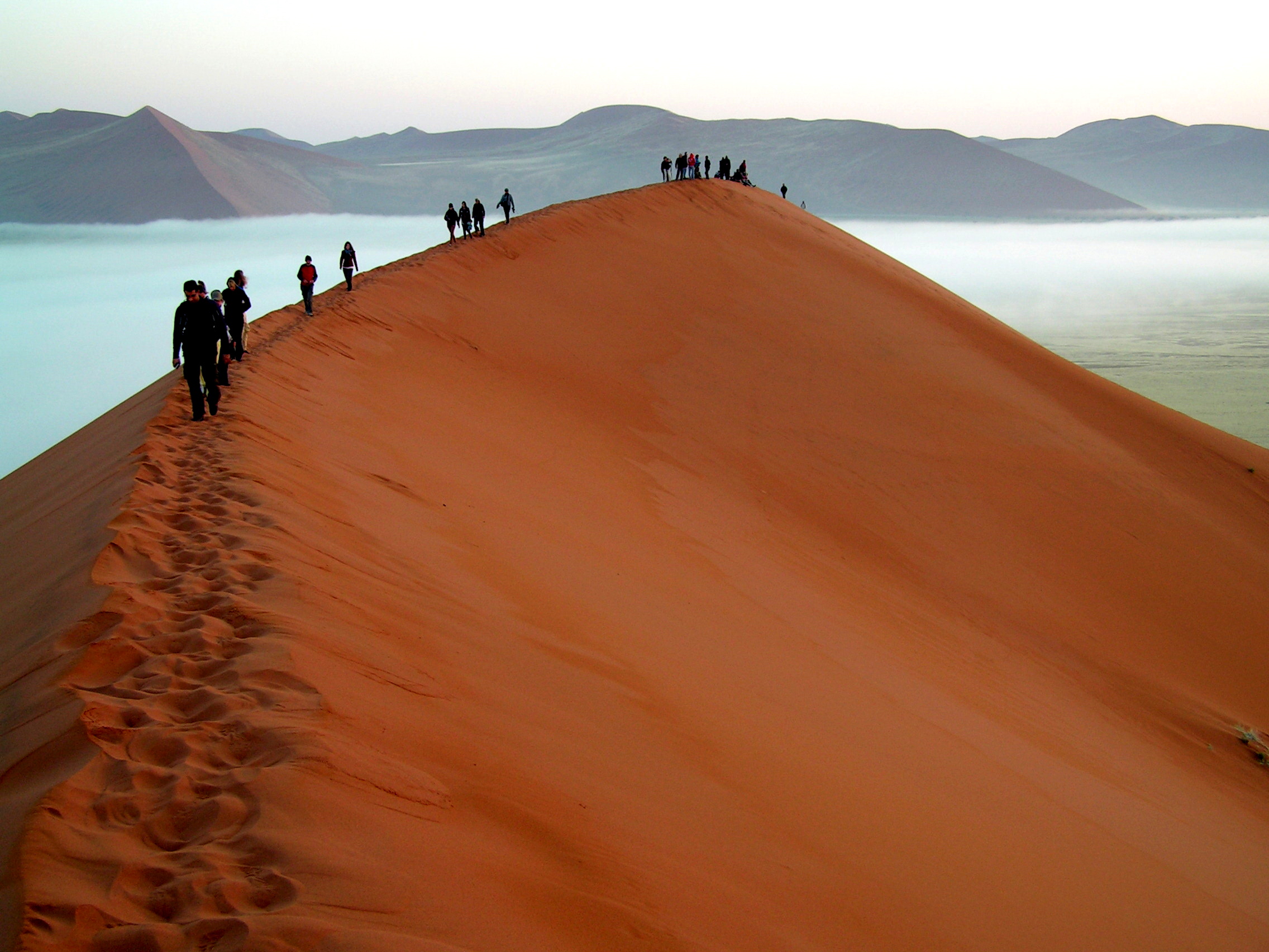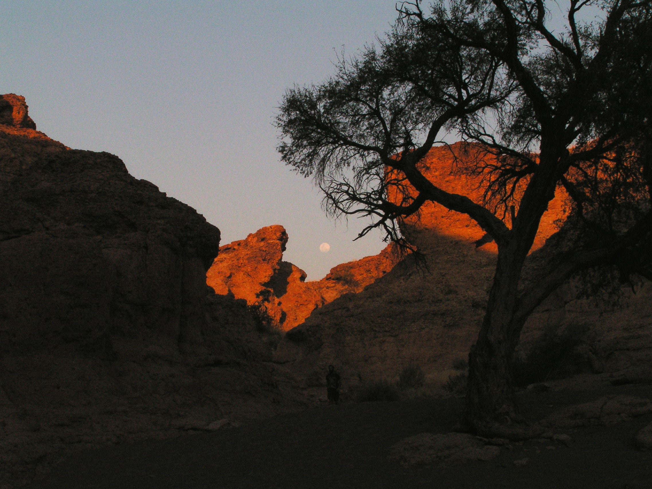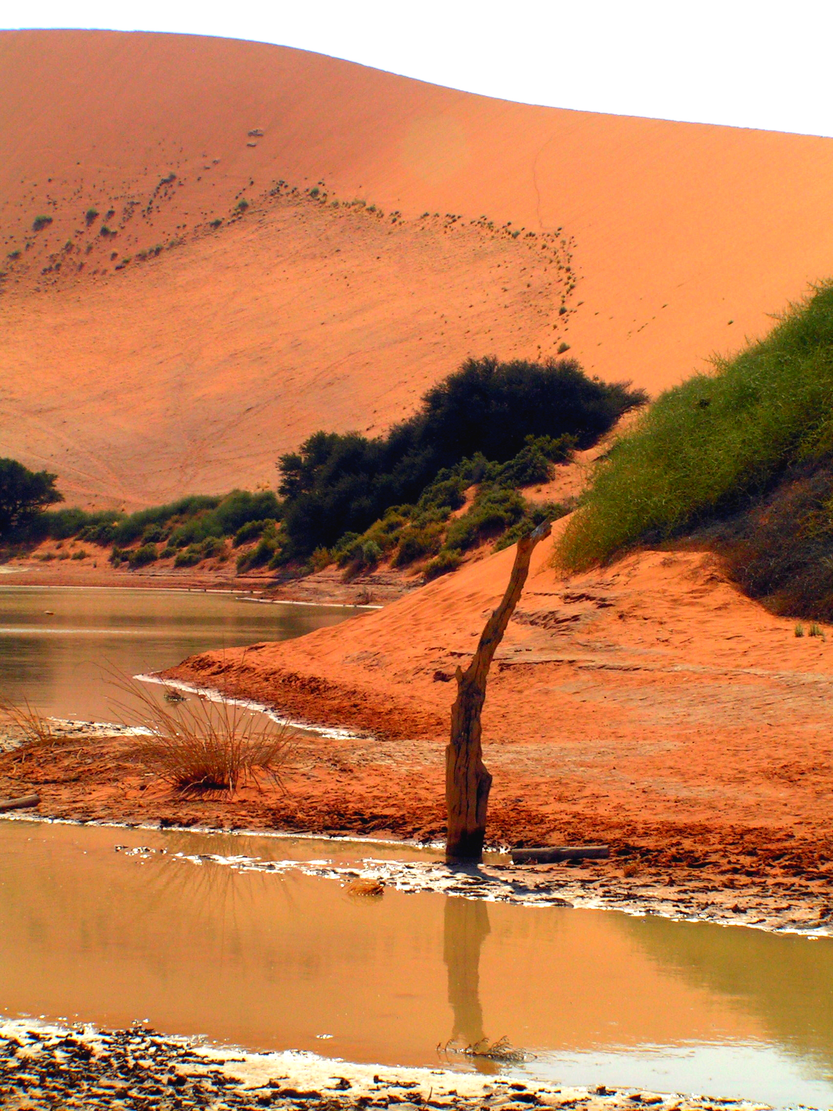 It’s a free day today for both the travellers and more importantly the guides. News at breakfast was not a good one. Our specialized vehicle had more problems. A mechanical or engine part had burst and were awaiting spare parts to arrive. Most of my fellow travellers had planned to do skydiving. There is an assortment of things to do while in town. I choose to get intimate with the desert. A group of us end up with a guide and a FWD and headed into the desert. The trail is almost sandy all the way. It looked totally arid. I can’t imagine life surviving here. Drought resistant plants do survive here. The Dollar Bush is one. Succulent rounded leaves absorb moisture from the air. Nearby was a spindly looking plant. These plants are adapted well to this harsh environment. Rain is very little and sparse. The fog created by the Benguela Current seemed like the only source for both flora and fauna. In a wide valley, the now dry Swokop River supported a variety of plants including shrubs and small trees. These plants survived by throwing deep roots to tap the underground water. The oasis in turn provided wildlife to thrive particularly birds.