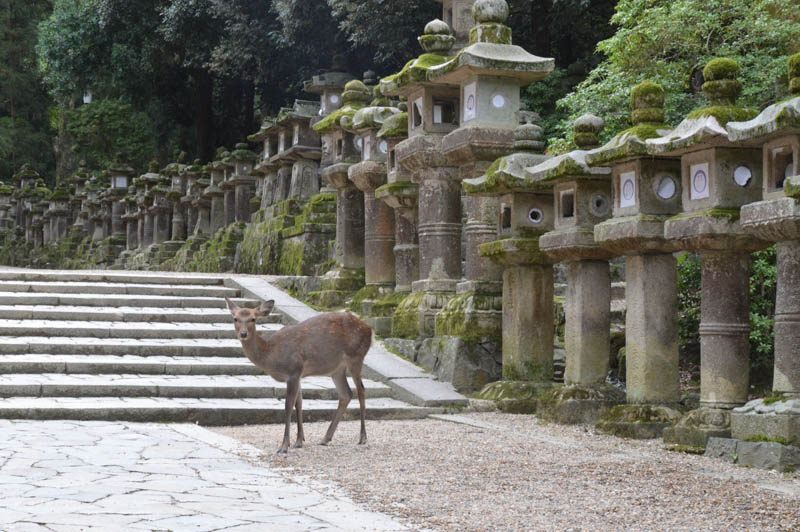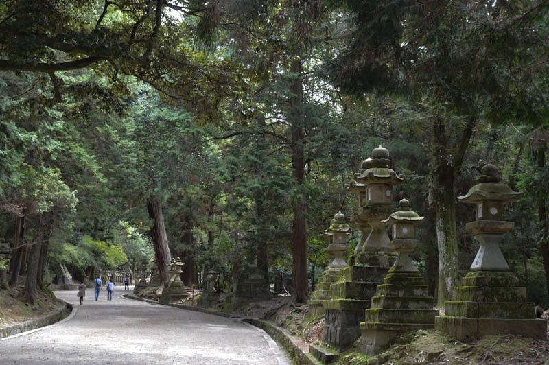 Hence, the “ema”. Water sprouted off a dragon’s mouth into vessels. Bamboo ladles are placed here for worshippers to wash their hands and face. A tranquil place indeed! Beyond this shrine, a path leads uphill into the mountains to a few smaller shrines. We exited the shrine via another flight of stone steps lined, on both sides, with numerous stone lanterns. This path led towards the most celebrated shrine in this park, Kasuga Taisha.
