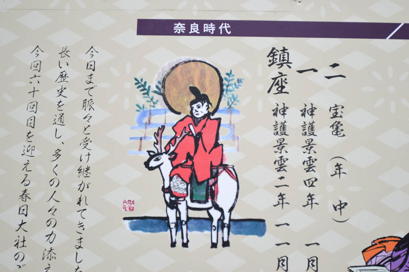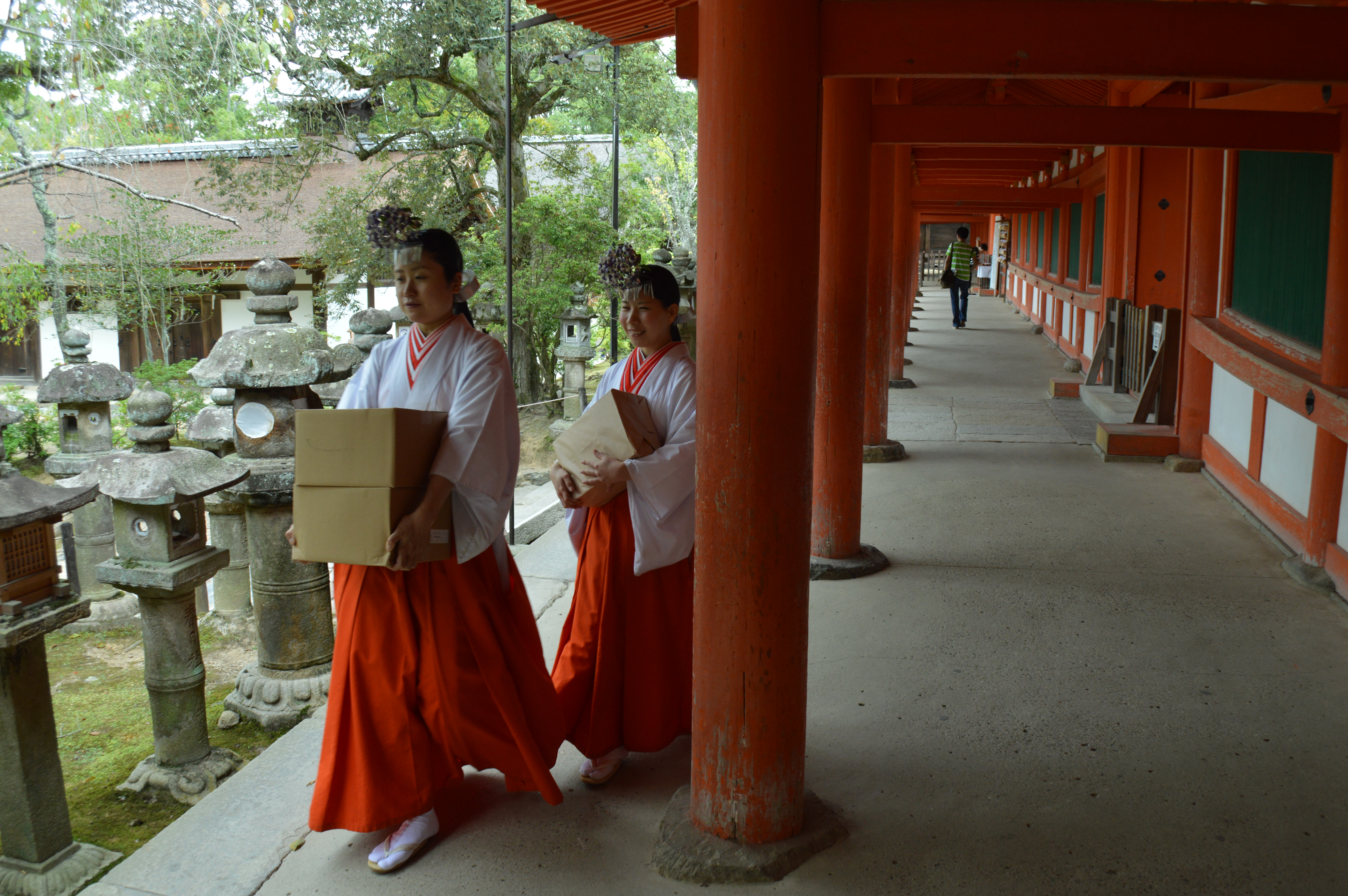The wisteria flower, “nodafuji”, is considered very important for the shrine. The name Fujiwara could also be read as ‘Wisteria field’. Near the exit of the shrine we encountered a couple of “Mikos”, temple assistants, whom had wisteria worn in their hair. A sika deer greeted Navindd on the exit corridor. The deer that roam freely are protected and said to the messenger of the Shinto Gods. They are not only protected but also revered and adored. We passed several sculptures around this green Nara Park.