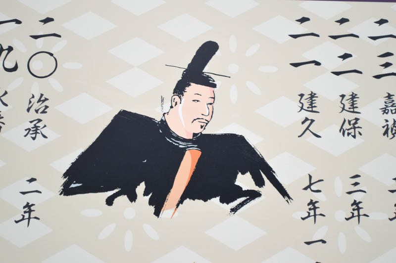 Although there were a few people wandering around, the atmosphere here was serene. A structural wisteria tree with barely any leaves was positioned on the east end of the rather long vermilion and gold lacquered building. We continued towards the “chumon” gate. Inside the Main Hall, “Honden”, a wedding ceremony was in progress. The groom and bride were dressed in white flowing robes. In attendance were the family members, seated on the floor, and a Shinto priest assisted by a white top and orange gowned miko. A small clump of purple wisteria was attached on her forehead. It was a sombre ceremony. On the wall was a colourfully painted mural.