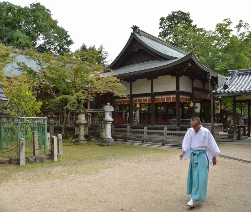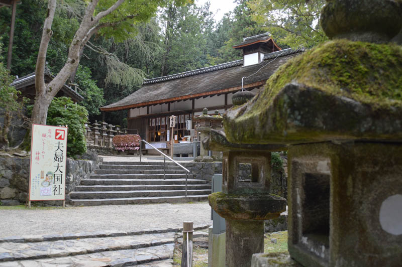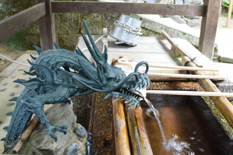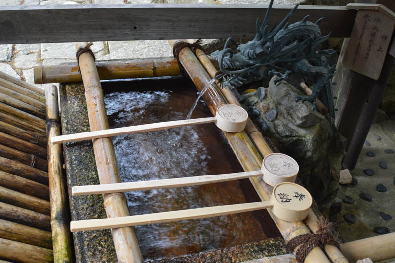 The main hall is over 350 years old and the beautiful architecture reflected old Nara designs. Over-sized oval shaped paper lanterns hung along the courtyard hang from the ceilings. Framed pictures and art hung above the doors. At the end of the spacious cobble stone courtyard, surrounded by tall trees and vegetation, worshipers cleansed their bodies at a dragon water fountain with the bamboo ladles provided.