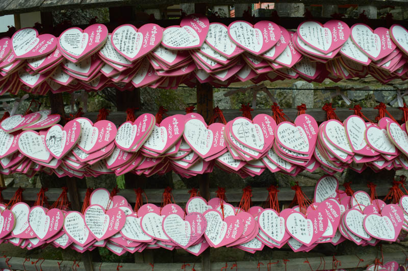We reached Kasuga Wakimiya Shrine via a flight of stone steps. Wakamiya-jinja is a branch shine of Kasuga Taisha Shrine and founded in 1135. It was quiet and hardly any people around. The straw thatched roof added an appeal of spiritualism in this ambient wooded hill. At one end of the building, a wall of pink heart or love shaped “ema” hung on a wall. The deities enshrined here are for married couple, so prayers made here are mostly for happy marriage and fortune in matters of love.