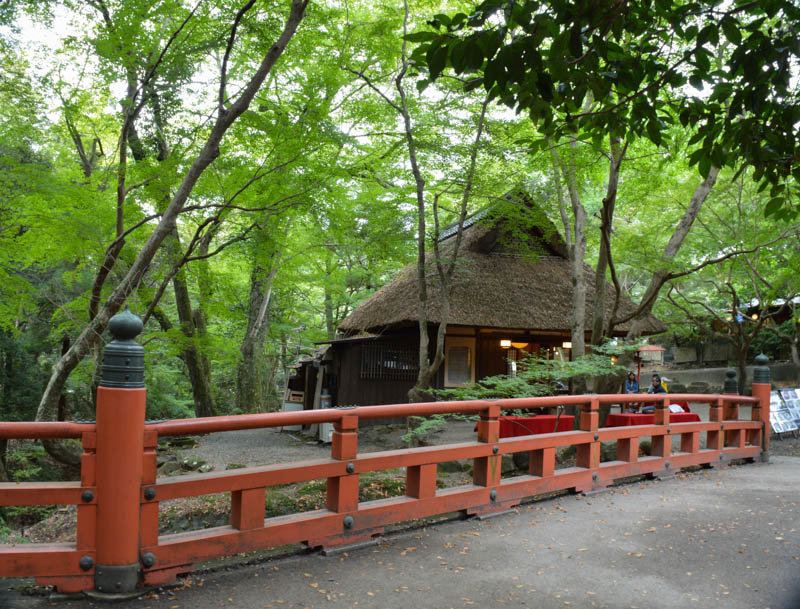 Not far, near a vermilion painted bridge over a slow flowing stream amidst the wooded forest is picturesque thatched-roof teahouse, “chaya”. A few low tables were set up outside under the trees. Across the bridge were a few more shops. We entered into a restaurant. It must be the most atmospheric place to eat, amongst this wonderful and refreshing greenery. The location was exceptional. Not quite under the trees but strips of bamboo roof instead.