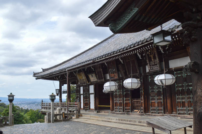 Next to this cluster of buildings, a steep series of stone steps ascended to the popular Nigatsu- dō temple, “The Hall of the Second Month”. It was founded in 752. Sited on the hillside of Mount Wakakusa, the balcony presented a commanding view of the sprawling city.