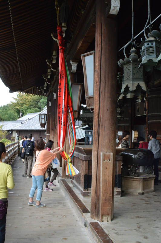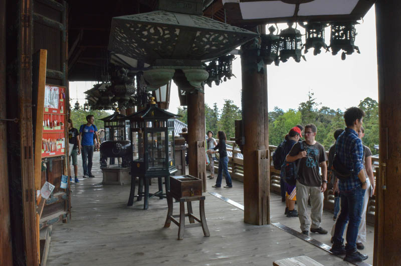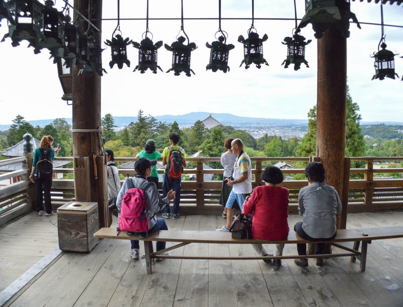 Under a row of bronze lantern hung above, the expansive views of Nara, from this elevated position, are visible. Both, the old and new buildings existed side by side in a densely planted city. At a closer proximity, is Todai-ji’s widespread temple complexes incorporated within Nara Park. There was an air of serenity. Everyone on this balcony looked out contemplating their own lives, young and old. Incense fumes filled the still air and worshipers prayed with clasped hands against their chest. They bowed several times in reverence.