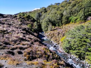 The track was relatively level with the occasional steady climb and descent. At 1100, we arrived at the Taranaki Falls Track junction. We visited the falls on day one as we anticipated today’s poor weather. Suddenly, the clouds cleared to reveal the falls, which appeared just of the main track. In the background, the fresh green beech trees. A few meters on, we crossed a bridge over the Wairere Stream. Just a few meters away, the stream disappeared over the falls. The stream looked small, but it plundered down 20 meters. From here, Whakapapa is only an hours’ walk.