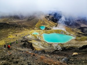 We just wanted to descent and get away from this strong icy wind. This was easier said than done. It was a steep descent over a scoria filled ridge. The turquoise coloured Emerald Lakes, a collection of three small explosion pits filled with water, appeared momentarily before consumed by the prevailing fog. A small window without fog provided some stunning views of not only the Emerald lakes but also the distant Blue Lake, the trail towards now defunct Ketetahi Hut, the steaming fumaroles, the North and Central Craters. With good balance and careful sliding over the loose scoria scree, we managed to get off the crater rim. Walking poles can be useful in this steep descent.