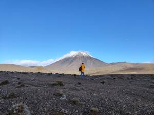 As we progress, on some stretches, the ground was flat and covered with fine volcanic sand. As the sum warmed the land, clouds dissipated.  Ngauruhoe eventually appeared with fresh snow on its conical peak. The sight was magnetic. Against a cobalt blue sky and half-moon, it was magical. Views of Both Ruapehu and Ngauruhoe constantly appeared with the ebb and flow of the track. We descended from one giant wall towards a tiny stream in the valley. Like all walks, if you go down, there is a obvious uphill climb. Slowly we climbed up over a vast flat mountain.