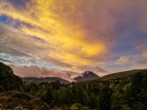 Moving clouds partially obscured the summit of Ngauruhoe. Mangatepopo Valley was carved out by glaciers from Tongariro. Around 1730, thick clouds descend on the mountains and temperatures dropped. Sam, the warden, revealed that tomorrow’s weather was not good. Strong wind, rain and cold temperatures were expected in the afternoon onward. We planned to depart early.