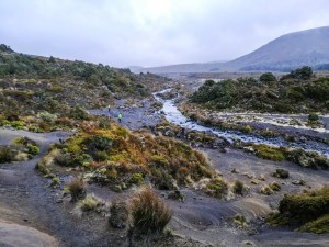 Although wet, cold and windy, the landscape was stunning. A very primordial landscape. Visibility was less than 50 meters. At one point, near a stream, the wind howled through – a wind tunnel. Unfortunately, with very poor visibility, I could only manage slow progress as I was unable to locate the guide poles. My fellow hiker’s hands were now frozen. Every adjustment of gear and clothing was painfully slow. I was looking forward to seeing Tama Lakes as we continued onto the Tama Saddle. It was exposed and windy. We arrived at the junction to the lakes, at 0930. With deteriorated weather, there was no hope of seeing anything. It was just a white-out. We continued towards Whakapapa on the Tama Lakes Track.