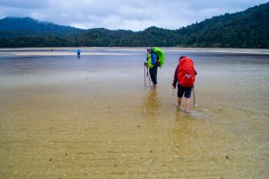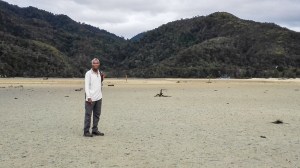 We woke up to the sound of rain. Today is critical that we cross the Awaroa Inlet at low tide. There is no other option. Bags water proofed, rain gear on (including a poncho) and with a spirit of adventure, we headed out towards Awaroa Hut. We left around 0630. Low tide crossing can be made with two hours on either side of the lowest level. Need to make allowances for the main crossing, that would take about 30 minutes. . First, we walked on the grassy airstrip. We could all be easily sported with our bright rain coats. The first crossing is a river crossing. Then onto the beach towards the hut. We stopped at the hut to make breakfast and a sense of ‘comradeship’ developed as we met other fellow hikers on the same route. In a short time friendship is bonded. Everyone was preparing for the low tide crossing. We packed and headed out around 0745. High tide would come in around 0830. Bare footed, we walked across fast flowing streams from ankle to knee depth. Beware of crustaceans and soft mud. Low cloud hung over nearby mountains. There was a breeze.