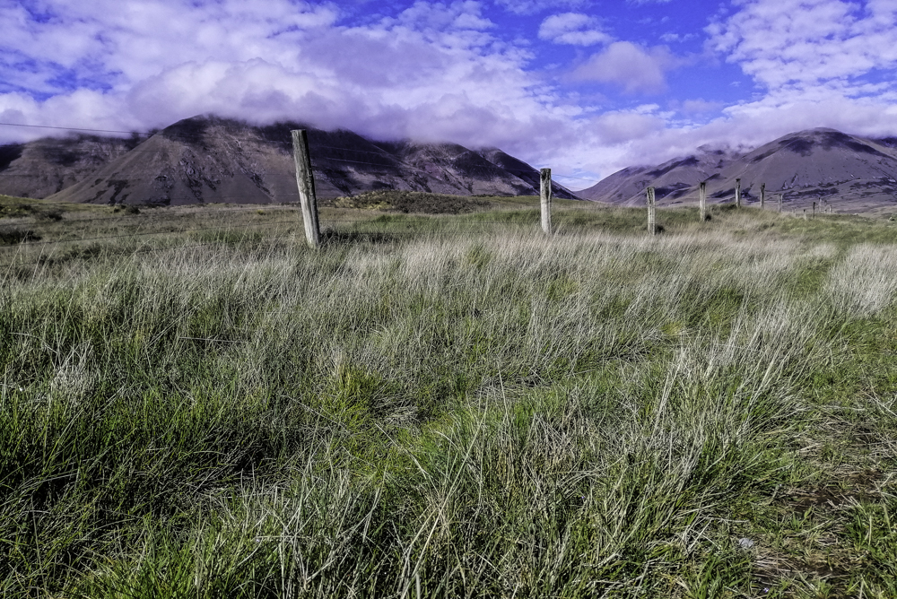 From the car park, the hike is estimated 1.5 hours return. The land from here to Mt Sunday is farmland with cattle grazing on the sunny day. A thick band of cloud hung steadfastly just below the summits. Leafless short scrub bush are scattered on the grassy fields. Along a fast flowing Deep Creak , tussock grass is dominant. Asburton Lakes area has some unique plants and animals. One such animal is the rare upland long jaw galaxias (fish) whcih can be spotted in this creek. The Rangitata River and the surrounding creeks are also spawning ground for Chinook or King Salmon.