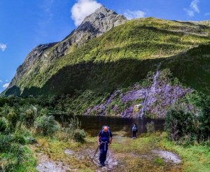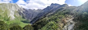 Imagine, besides a single road from Te Anau to Milford Sound and the Milford Track, nothing much had changed for ions. Fiordlands ancient beauty is here for all whom ventured. The views from the slope of Mt Hart towards Arthur Valley and beyond was exhilarating. The memorial blended with the surrounding grey mountains. There was no wind. The clouds moved rapidly giving Lake Ella, an alpine tarn, an organic black and sky blue appearance.
