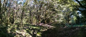 Eventually, we could see the Beech forest tree line. After crossing a bridge, under the canopy of the forest trees, it was cooling. a relief from the searing heat. Moss and lichen covered trunks and branches. The uphill track twisted around the slopes with exposed tree roots. Within half hour we exited the cool forest into an open hilltop (1268m). Across the meadow of low colourful alpine shrubs and ground lichens, Ngauruhoe was visible, with the summit covered in in clouds. To the west however, the landscape was barren valley, covered in volcanic rocks. The view led towards the almost invisible Ruapehu. As we descended, Waihohonu Hut appeared at the end of the vegetated area. Beyond that was just rocks. a short walk after crossing the fast flowing Waihohonu stream, we reached the hut at 1100.