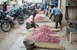 People, although busy are friendly and spared time to chat. While weaving and winding around the cultivated fields, we came across a man with two bulls. Their horns were especially menacing. During the latter part of the trek, Sekar encountered a black cobra running across the field. We returned to the village centre. At a collection centre, bails of garlic were loaded onto a lorry for transport to the big cities. Near the Murugan Temple, a sundry shop was busy with customers.
