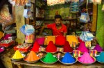 A few spice vendors, vegetable and fruit sellers were tucked into this crumbling building. Tarpaulin stretched over the top, some in tethers, provided some shade from the elements. A young man, sat behind cones with vibrant colours and vivid hues of “kungumam” pigments – synthetic and natural?