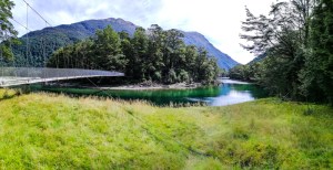 Once we emerged out of the tree canopies, we entered a grassland. On the left is the slow flowing Clinton River. In the middle of the grassland – luxurious Glade House Lodge (used by hikers from the expensive guided walks) with mountains as the backdrop. Today’s short walk awarded us with plenty of time to wander. The shallow blue-green river flowed under a long suspension bridge. Trout thrived in these cold waters. A paradise duck just splash-landed on the water.