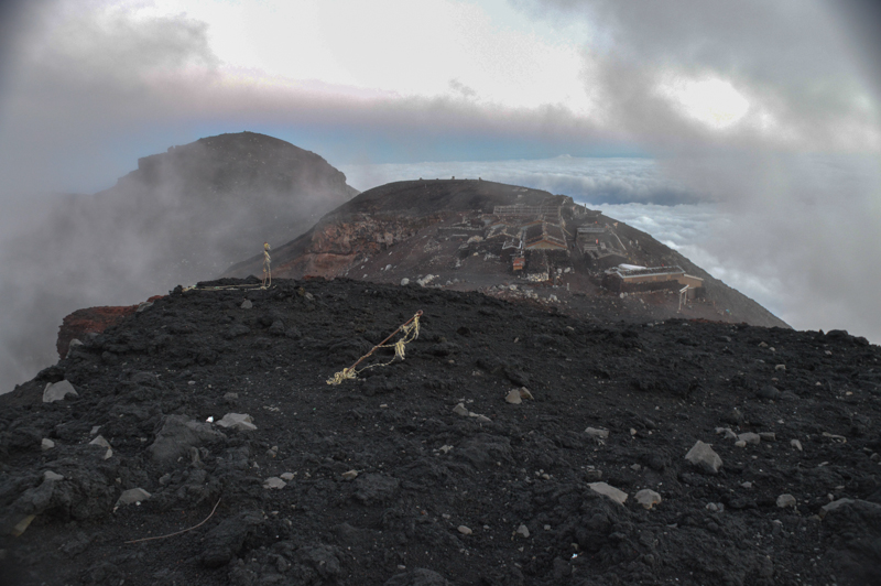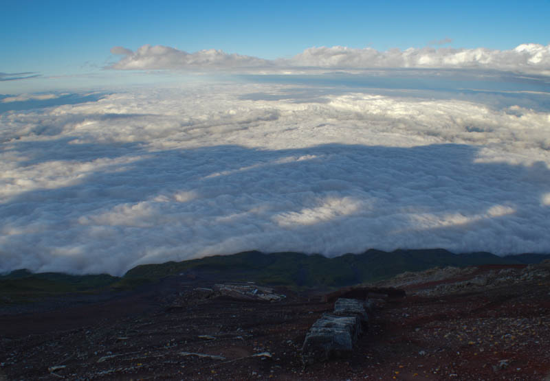 As we entered the hut, we were greeted by about two dozen weary but jubilant trekkers. Natsuko, an English speaker with whom I had booked the hut earlier, grinned brightly. There was one foreigner and the rest Japanese. We warmed up at a small fire place. The hut was basic but adequate. The atmosphere was cosy and jovial. One trekker called out to me to come into the cold and windy exterior. I braved the elements and witnessed the auspicious “Kage Fuji”, the shadow of Fuji reflected onto the swirling grey clouds. Throughout the accent, there were rarely any views of the lakes and towns at the base of Fuji as the clouds descended. After a simple hot meal, we collapsed into our sleeping bags in a long double bunk room, with a capacity of 300, for a deserved rest and reflection.