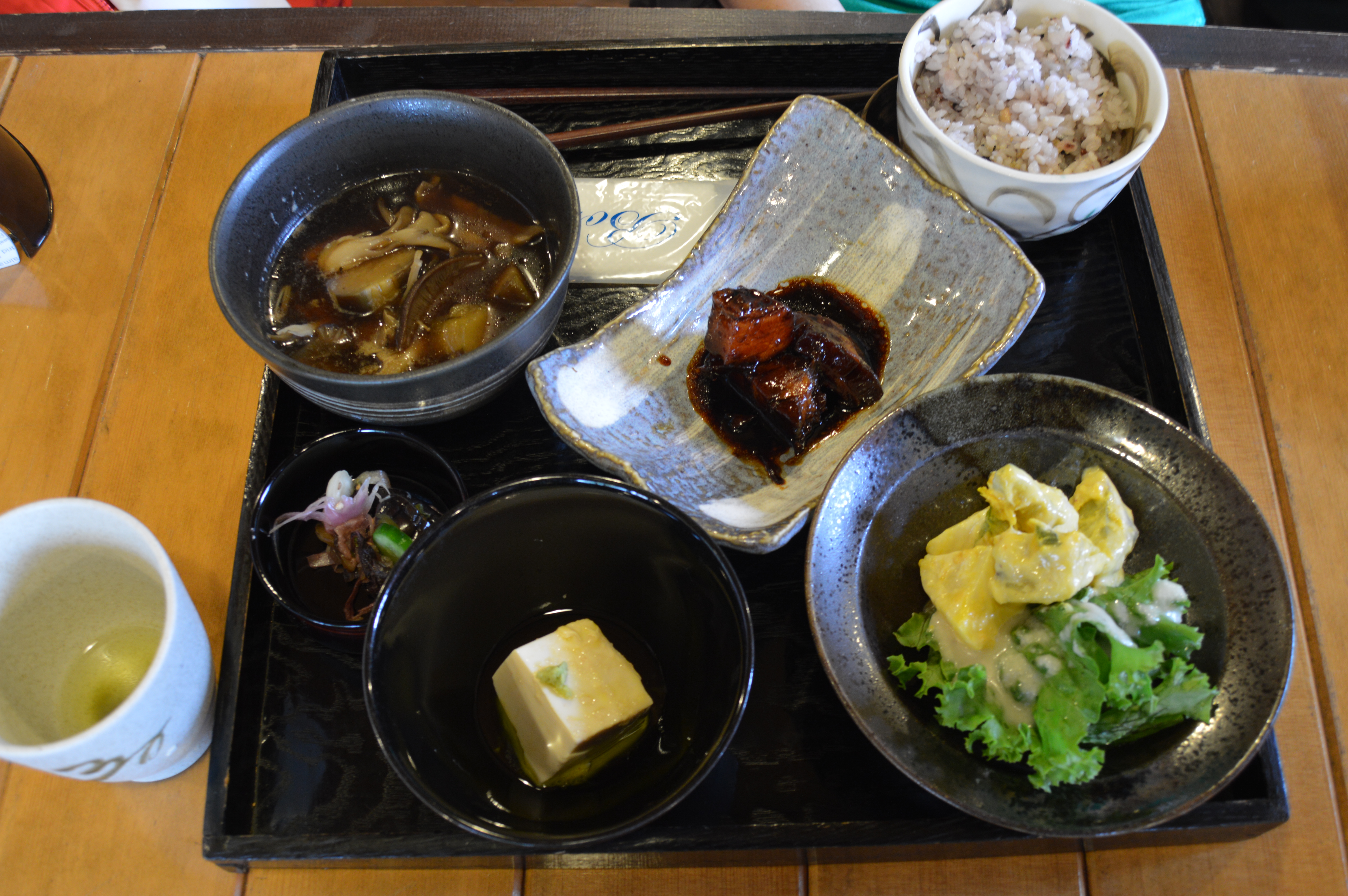 Along the main road, opposite a shrine, was a delightful eatery. It was small but had fabulous views of the lake and the rocky outcrops floating on the water. With our shoes damp and clothing wrapped under the rain coats, we decided to stop for lunch. The hostess could not speak any English. However, a congenial couple next to us acted as interpreters. There was only one fixed lunch menu – pork belly. I requested for a vegetarian option. The hostess obliged.