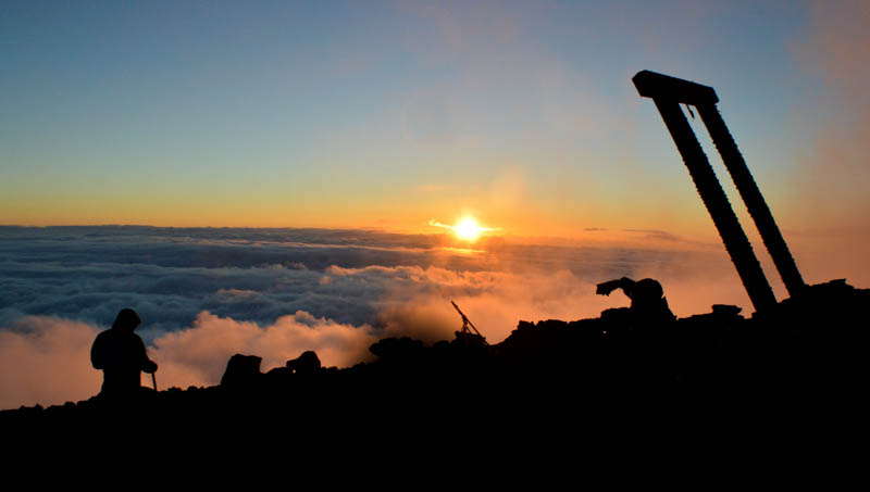 Slowly but surely we forged on guided only by light from our headlamps. Some trekkers were slumped on the ground with exhaustion. Altitude sickness is a serious issue. The steepness continued. The icy wind battered our faces. Gradually, the night sky turned to deep blue and the horizon was visible. However, heavy clouds prevailed. At 0430, we reached the white “torii” guarded by two marble lion statues. The last leg was a series of steps. We had reached the 10th station, the summit. A cluster of buildings occupied the narrow space including Kushusi Jinga shrine. Today’s few trekkers rested here. All the buildings were shut but rattled in the blowing wind. Tiredness from the walk vanished and our bodies magically seemed revitalised. A sense of having arrived came upon us. Navindd and I walked higher to the crater rim. A series of peaks surrounded the crater with the highest being 3776m. A thick fog engulfed the summit. Within minutes, the deep crater was invisible. Our hands were frozen. A glow emerged between the clouds and the grey sky. For a few precious minutes, we witnessed a magnificent sunrise – “Goraikō”, meaning “arrival of light”. The white clouds below turned to a sea of blue. Two Japanese hikers hailed at that sight. Moments like this, I truly appreciated the holiness of Fuji.