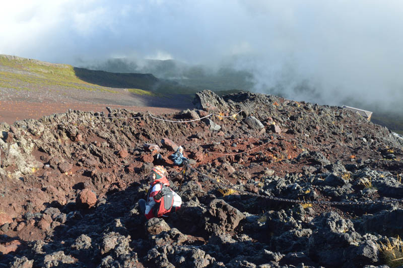 We started our trek out of the Fifth Station at around 1pm. The sun was high and the blue sky promised good weather. I have this mantra when climbing mountains – the mountain is the mountain. It meant, the mountain will behave any which way it wanted irrespective of the weather or meteorological conditions. There is no bad weather if we are well prepared. Naturally extremes do happen though unpredictable. I knew there was very little help once on the mountain. I carefully itemised all the apparels and gear required. The warm weather gear included thermals, and some light food. I was not prepared to take chances with my family. We encountered some tired faces of trekkers’ descending. The marked path eventually led us out of the human traffic and into a forested area. When we emerged out into the open, a zig- zag path led upwards which inclined steeply. Past concrete retaining wall, a collection of seventeen huts clanged onto the steep reddish rocky slopes. The heat was intense and hardly any breeze. Once we passed the tree line, high altitude flora of low lime green shrubs covered parts of the slope. The exposed areas were barren rusted iron volcanic rocks. Navindd impressed me with his agility and strength. I reminded him to slow down. At these heights, altitude sickness can strike anyone. Lee Cheng and I continued with our rather slow pace with intermittent rest and drink stops. The views of the distant land below us were obscured by the dense thick clouds.