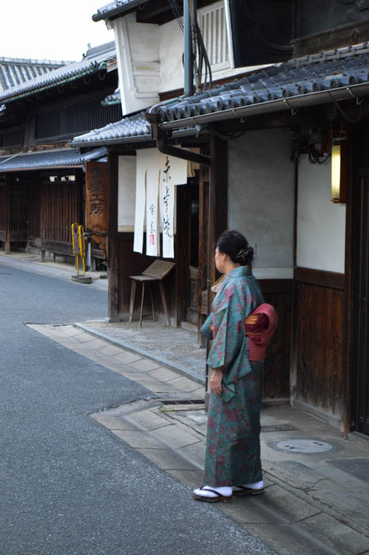 We wandered the narrow streets of Naramachi. Besides the lovely restored wooden homes with tiled roofs, one common sight is the overhead electrical wires. As we walked, I noticed that there were hardly any people around. Doors closed, “noren”, curtains, flowing in the light breeze and hardly any sound. An elderly lady dressed in a lovely colourful kimono appeared from her home and disappeared into an alley. The streets branch off into complicated alleyways. We were unsure of where we were going but it did not matter. Getting lost here is a good thing. We came across gift shops and small eateries. The more we walked in this laid back old town, the atmosphere of the 19th century oozed out. A lady dressed in kimono, emerged out of her shop and poured a bucketful of water onto the street. Then she swept the street of dust and re- entered the shop.