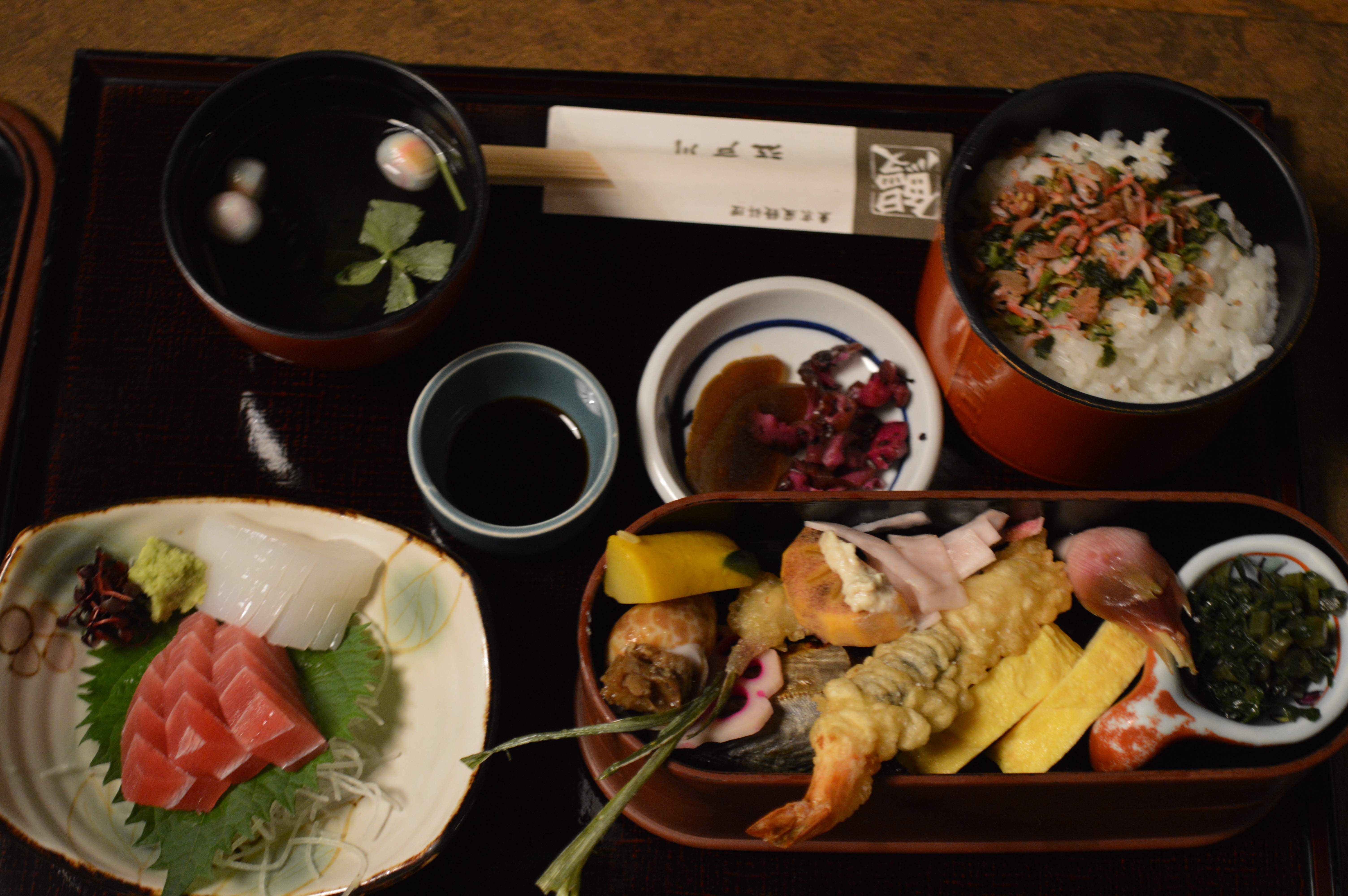 Not far, near a vermilion painted bridge over a slow flowing stream amidst the wooded forest is picturesque thatched-roof teahouse, “chaya”. A few low tables were set up outside under the trees. Across the bridge were a few more shops. We entered into a restaurant. It must be the most atmospheric place to eat, amongst this wonderful and refreshing greenery. The location was exceptional. Not quite under the trees but strips of bamboo roof instead.
