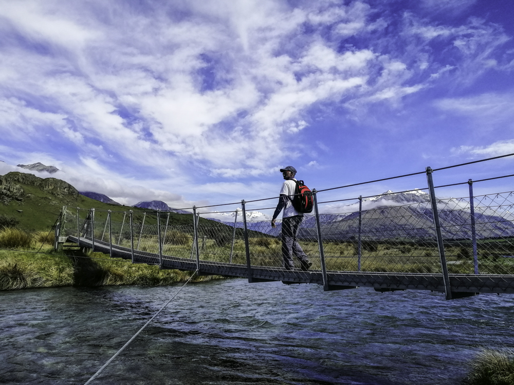Without realising, I could hear waterfall crashing over boulders. Through the trees, I could make out the grassy flat valley below. We decided to have some lunch under the tree canopy and away from the dreaded sandflies in the valley. We met two men planning to get to Mt Aspiring summit by day’s end. They waited patiently for us to pass as it is generally a one-way track. I admired their humbleness. The weather is expected to turn into rain the following day. Hence, their reason to attempt today. I would not be coming up here if rain was expected. Could be quite a treacherous hike. Finally, at 1230 we reached the suspension bridge over Liverpool Stream on the valley floor. It was easier than I had anticipated. Even, the two other ‘dangerous’ sections were a non-event. It was a relief nevertheless. Now, perhaps, dared to consider French Ridge Hut next!