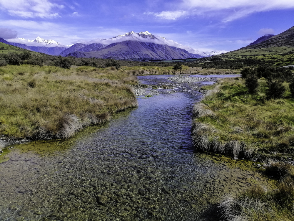 Now, it was a long hard slog back to Raspberry Creek Carpark under a scorching sun. Fortunately it was a gradual decline. We immediately refilled our water bottles in the streams. The waterfall along the way looked inviting. However, we carried on down the familiar valley. Now, turning back, I was able to spot Liverpool Hut. The many streams we forded yesterday seem to have higher volumes of water. We arrived at Aispiring Hut at 2pm. After a short rest, we continued out of the valley. A cool breeze helped a little. It was a relief to spot the suspension bridge leading towards Rob Roy Glacier. We finally reached the car park at 4pm. I was quite dehydrated.