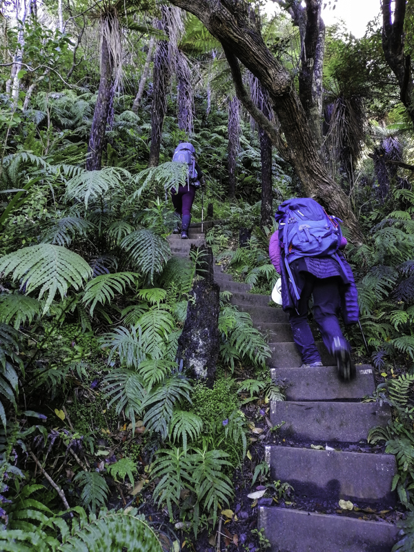 It turned out to be a very warm night. Perhaps the insulation in the hut was great. I usually don’t get good sleep in huts and this, although only four of us, was no different. A kea caused a raucous on the roof, probably around 5am. That woke me up. Another glorious sunny day was emerging. The peaks of Mt Braff and Aispiring reflected strongly in the bright morning sun. The air was still but pleasantly chilly. After breakfast and the usual tidy up, we left the hut around 9am. As the organiser of the hike, I took the lead and the ‘difficult’ sections of the stone slabs was first. It seemed easier going down. Sometimes on our bums. Eventually, we descended the same way as we arrived here – hanging on dearly to the tree roots and rocks. Our decent was slower. I was focused in every step and root to hold. In many places, it was easier turning around and climbing down.