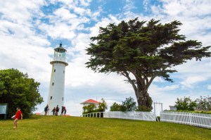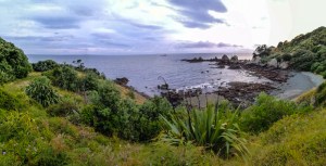 I arrived here with John and family on his sailing yacht. It took us about three hours. We saw a small pod of dolphins and blue penguins. We anchored just off Hobbs Beach and motored to the wharf. A ferry was anchored at the wharf. Large flowering Pohutukawa trees lined the beach front. From here, we walked to the bunkhouse along the Wattle Track. We were greeted with a array of bird songs. I was excited and looked at every tree, branch and ground to spot the birds. My first sighting was the Tui bird. They flew low and fast. A small, introduced and naturalised Brown Quail foraged along the track margins. The track was mainly under the canopy of the forest. I spotted a lime green Bell bird (korimako). After twenty minutes, through the spiky cabbage and crimson flowering Pohutukawa trees, the light house appeared on top of a hill. On the way up, I met Richard – my fellow hiker on the Routeburn Track. A wonderful coincidence.