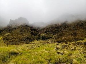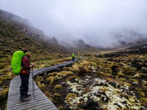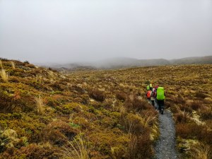 Although wet, cold and windy, the landscape was stunning. A very primordial landscape. Visibility was less than 50 meters. At one point, near a stream, the wind howled through – a wind tunnel. Unfortunately, with very poor visibility, I could only manage slow progress as I was unable to locate the guide poles. My fellow hiker’s hands were now frozen. Every adjustment of gear and clothing was painfully slow. I was looking forward to seeing Tama Lakes as we continued onto the Tama Saddle. It was exposed and windy. We arrived at the junction to the lakes, at 0930. With deteriorated weather, there was no hope of seeing anything. It was just a white-out. We continued towards Whakapapa on the Tama Lakes Track.